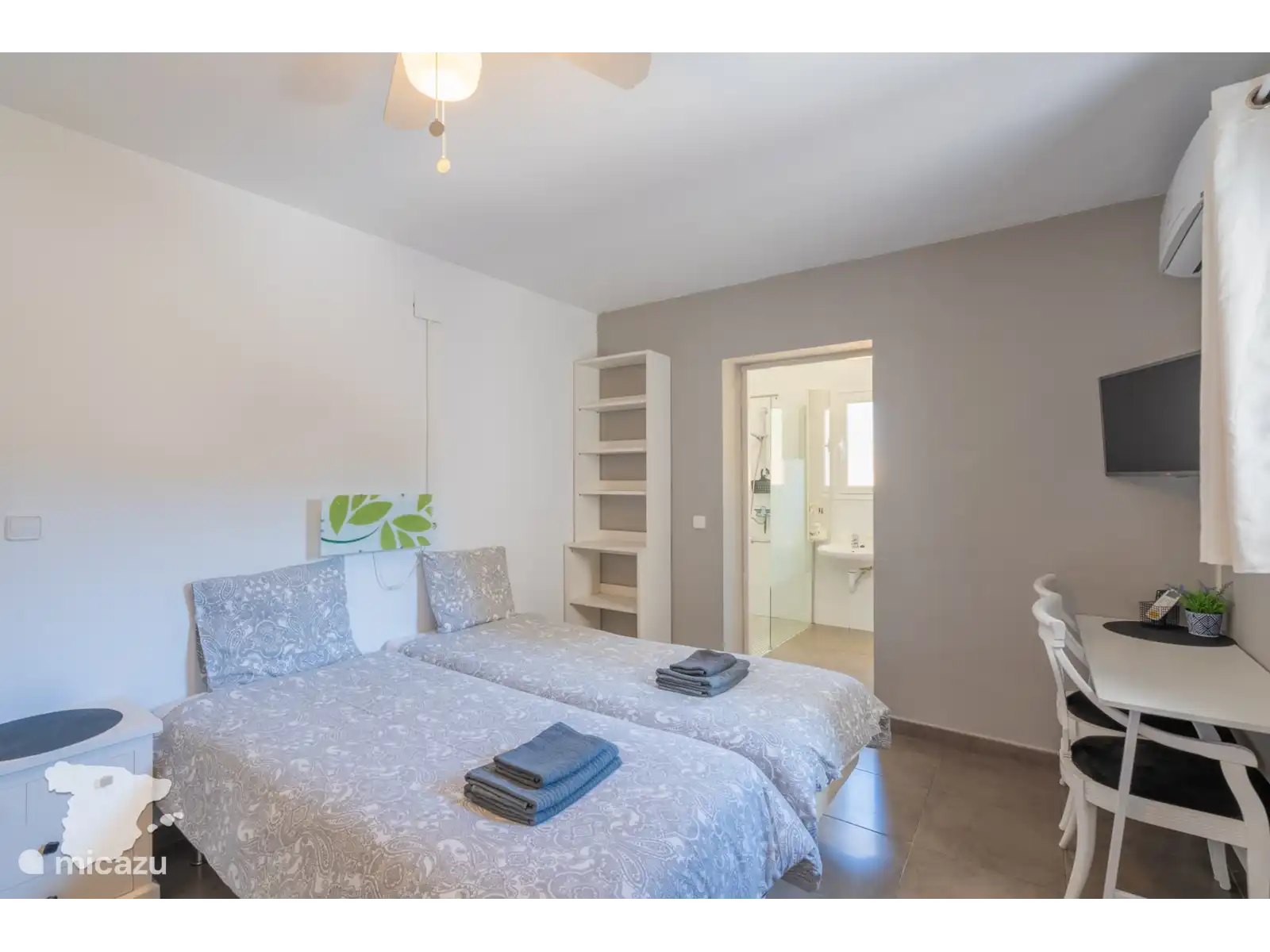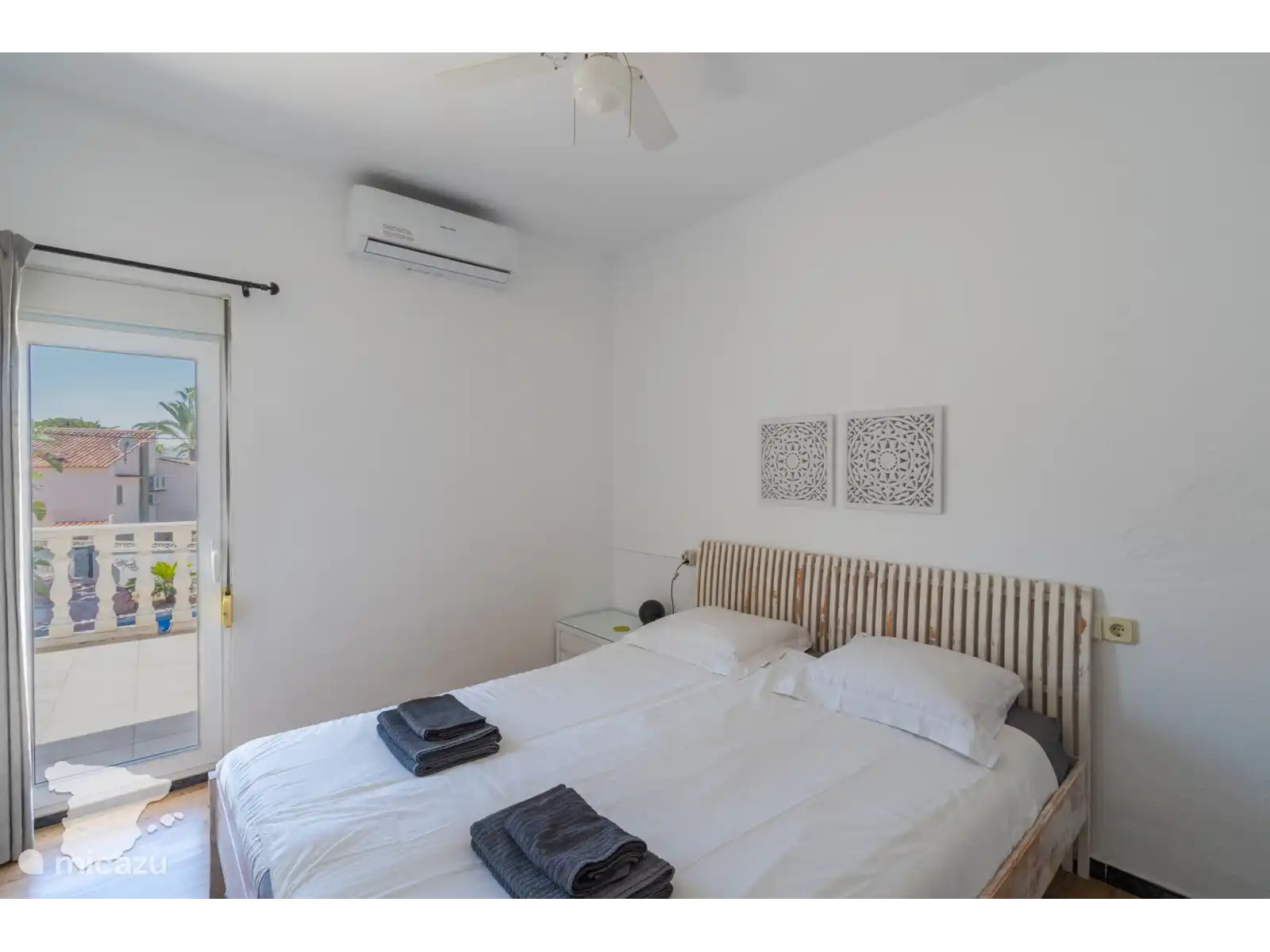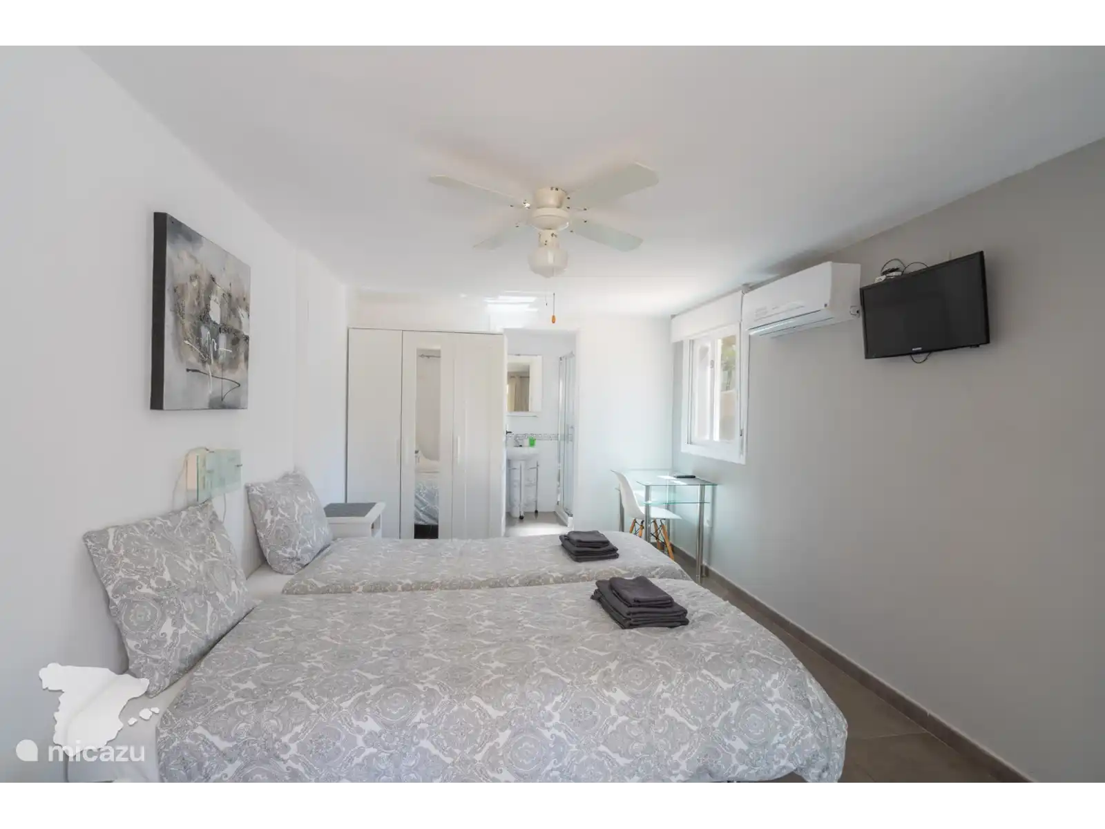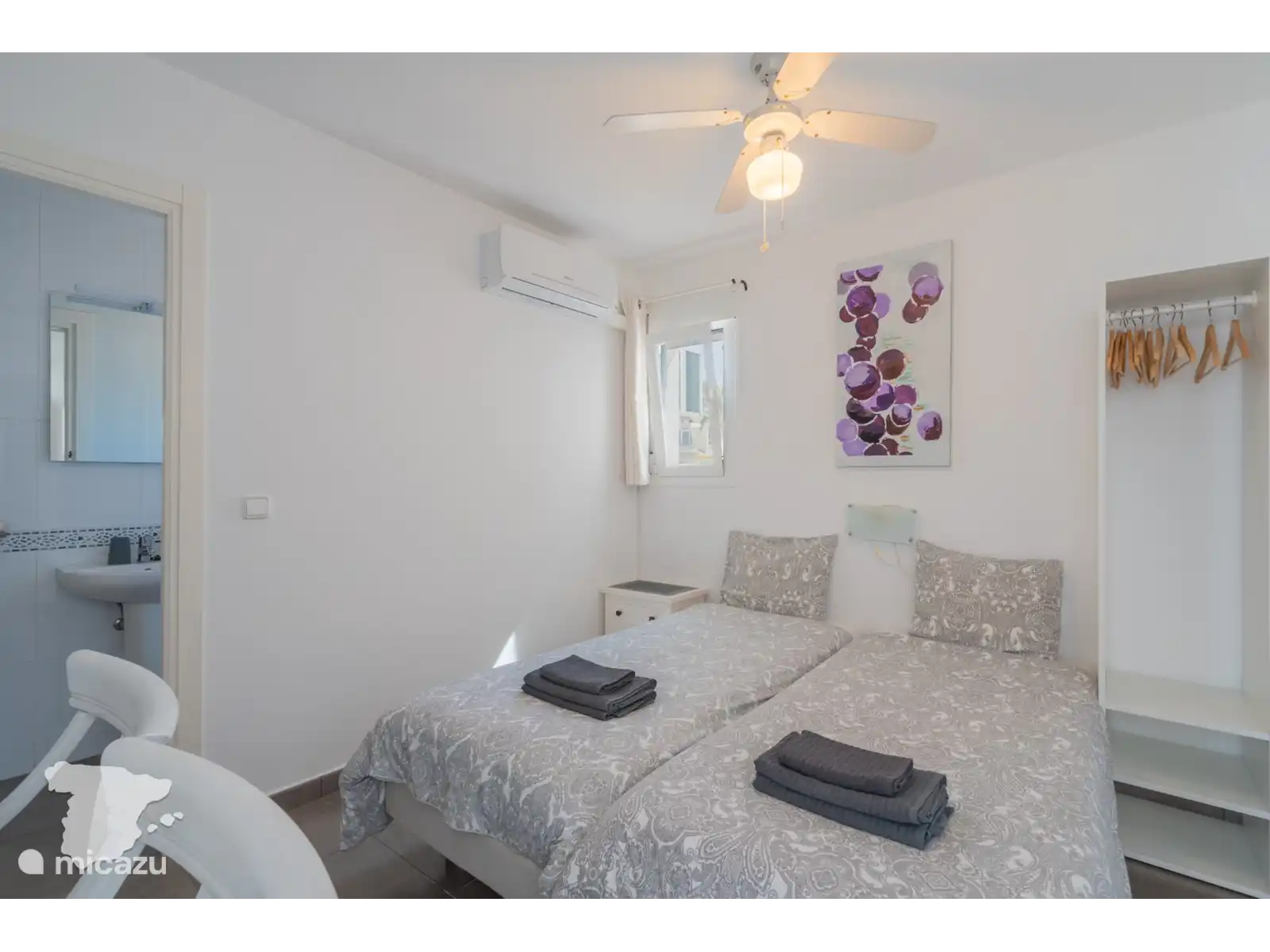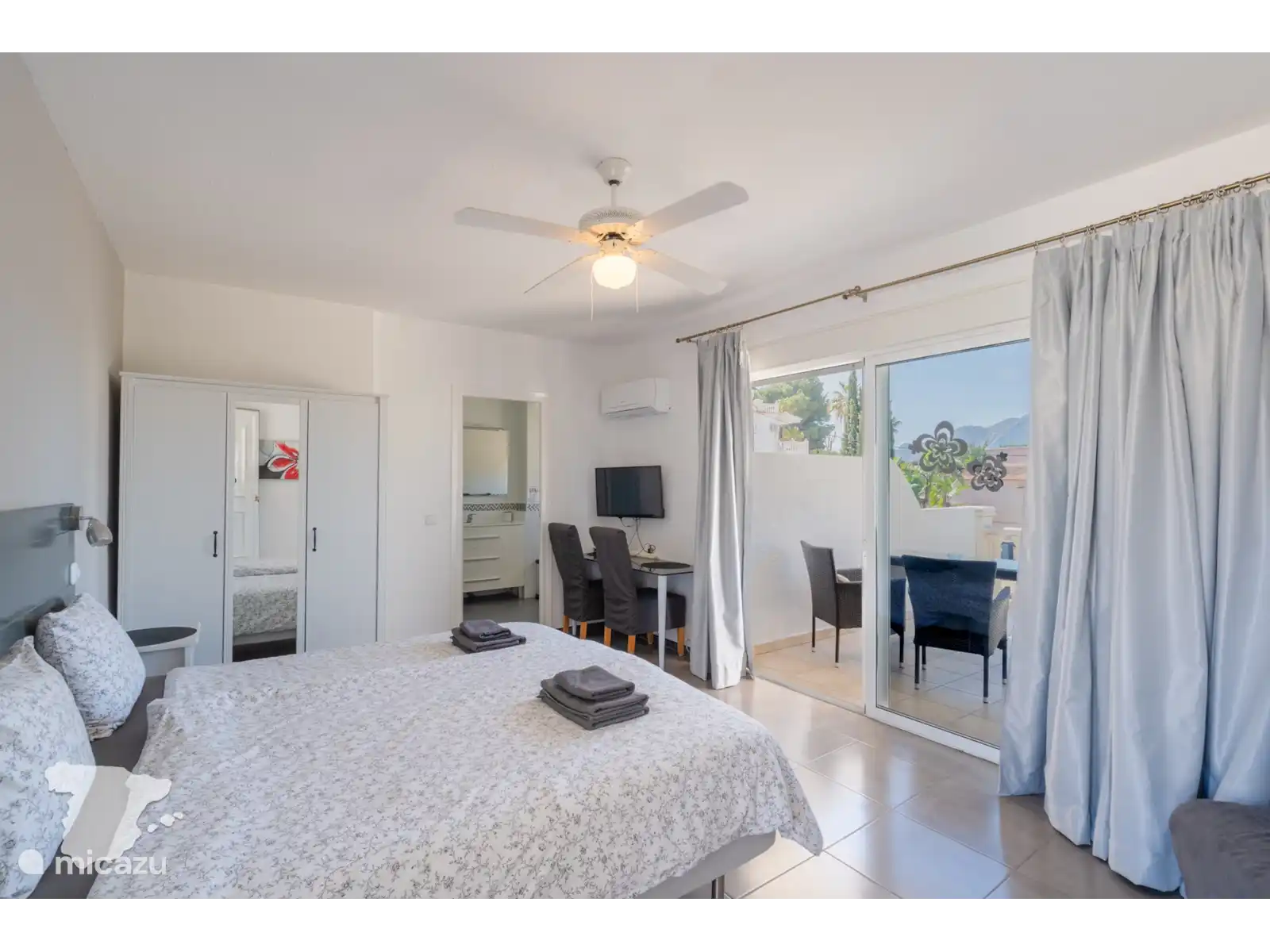 In de hoofdwoning vind u op de eerste verdieping 2 slaapkamers en 1 badkamer. De slaapkamers zijn voorzien van een tweepersoonsbed en de badkamer heeft een inloopdouche, toilet en wastafel. Op de begane grond vindt u nog een badkamer met ligbad-douchecombinatie, toilet en twee wastafels. Beide slaapkamers zijn voorzien van airconditioning.