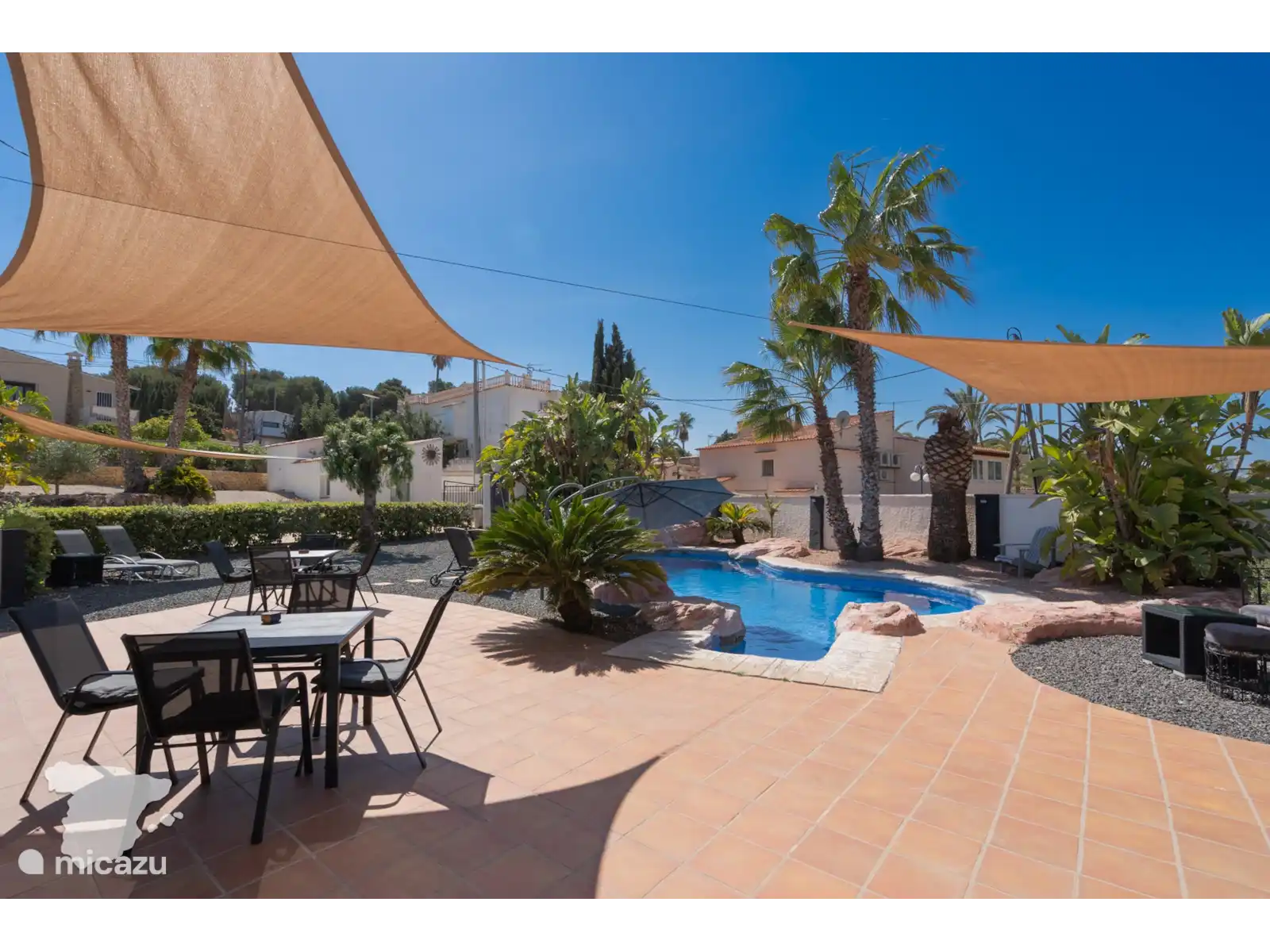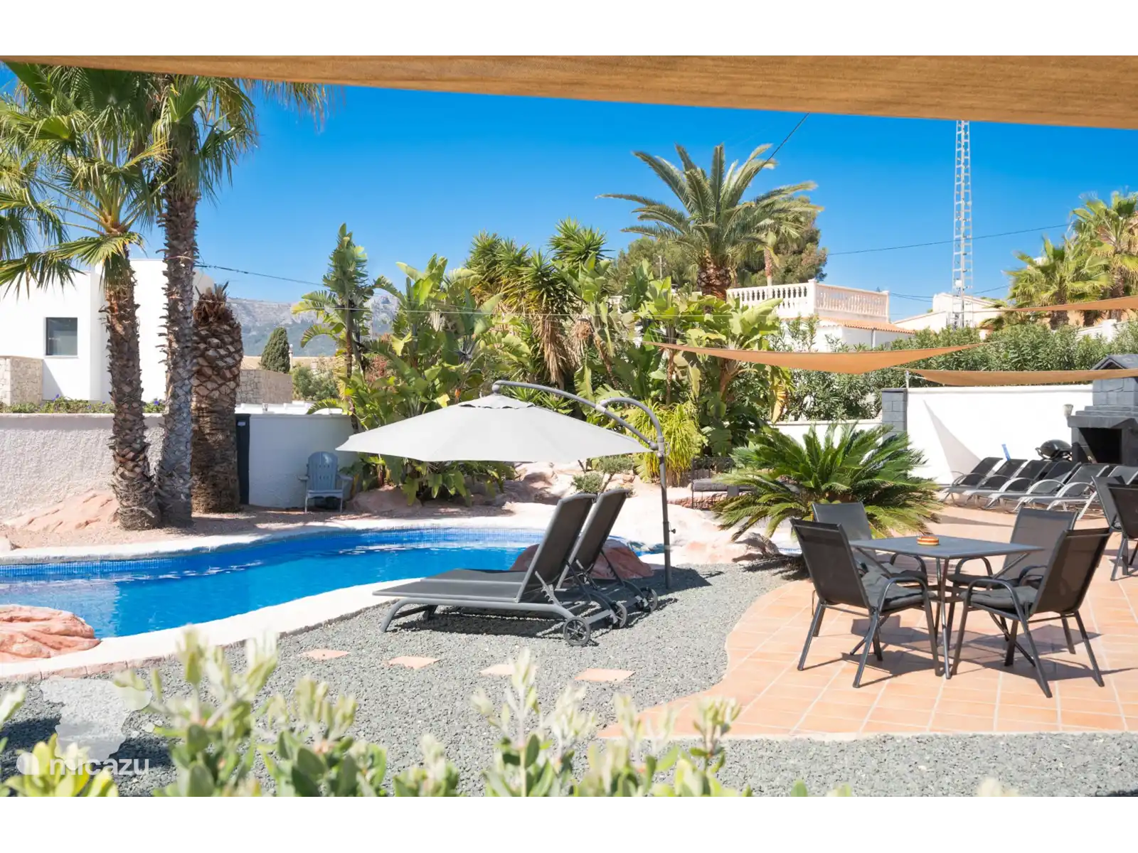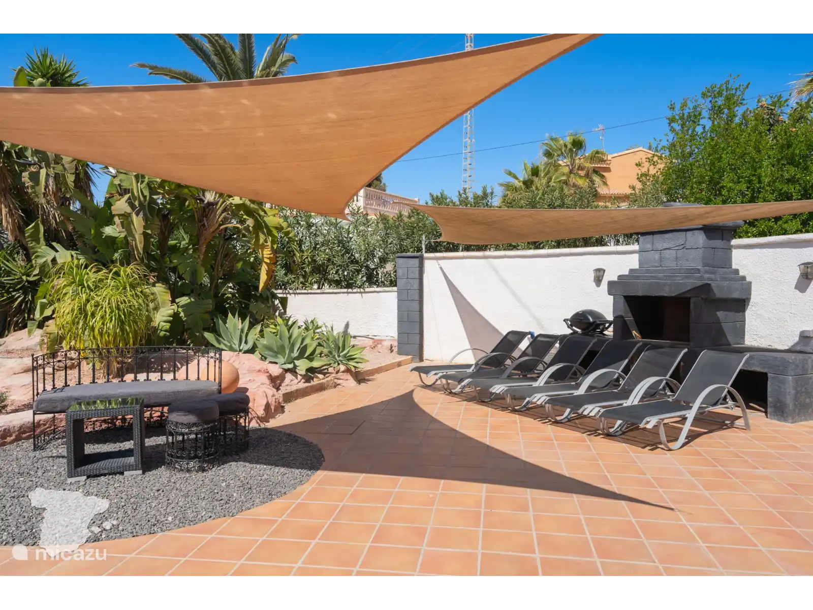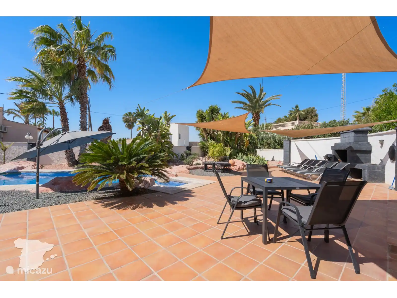 Gasten van alle leeftijden zullen genieten van het grote zwembad in de tropische tuin, die tal van plekken biedt om in de warme Spaanse zon te liggen. Of je nu een traditionele Spaanse barbecue grilt, samen een spelletje speelt onder de patio of een boek leest op de buitenbank, deze buitenruimte zal echt indruk maken op gasten!