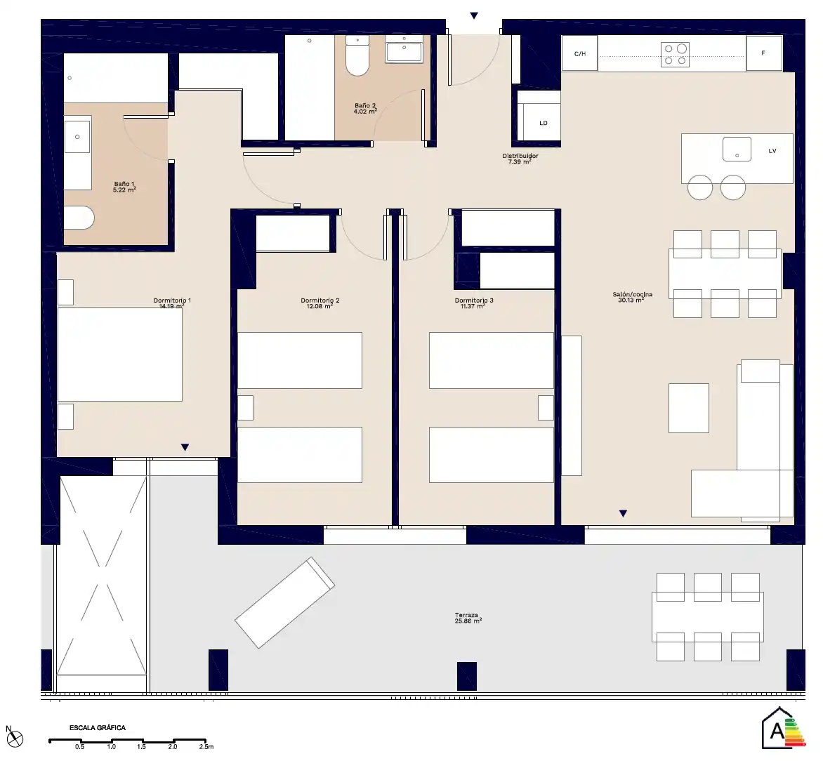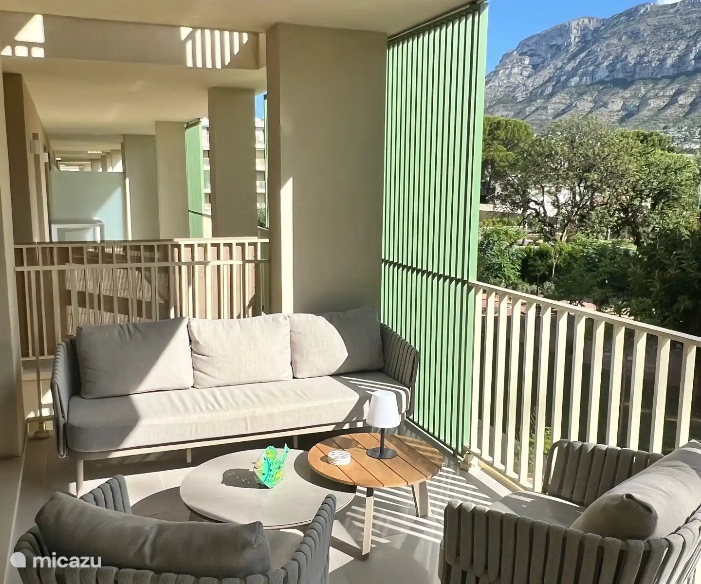 Het appartement bevindt zich op de tweede verdieping en heeft een ruim op het zuiden georienteerd terras met uitzicht op de binnentuin, het zwembad en het adembenemende Montgo gebergte. Het terras heeft een 6 persoons eettafel en een loungehoek. Het volledige appartement (incl. de 3 slaapkamers) heeft air conditioning.