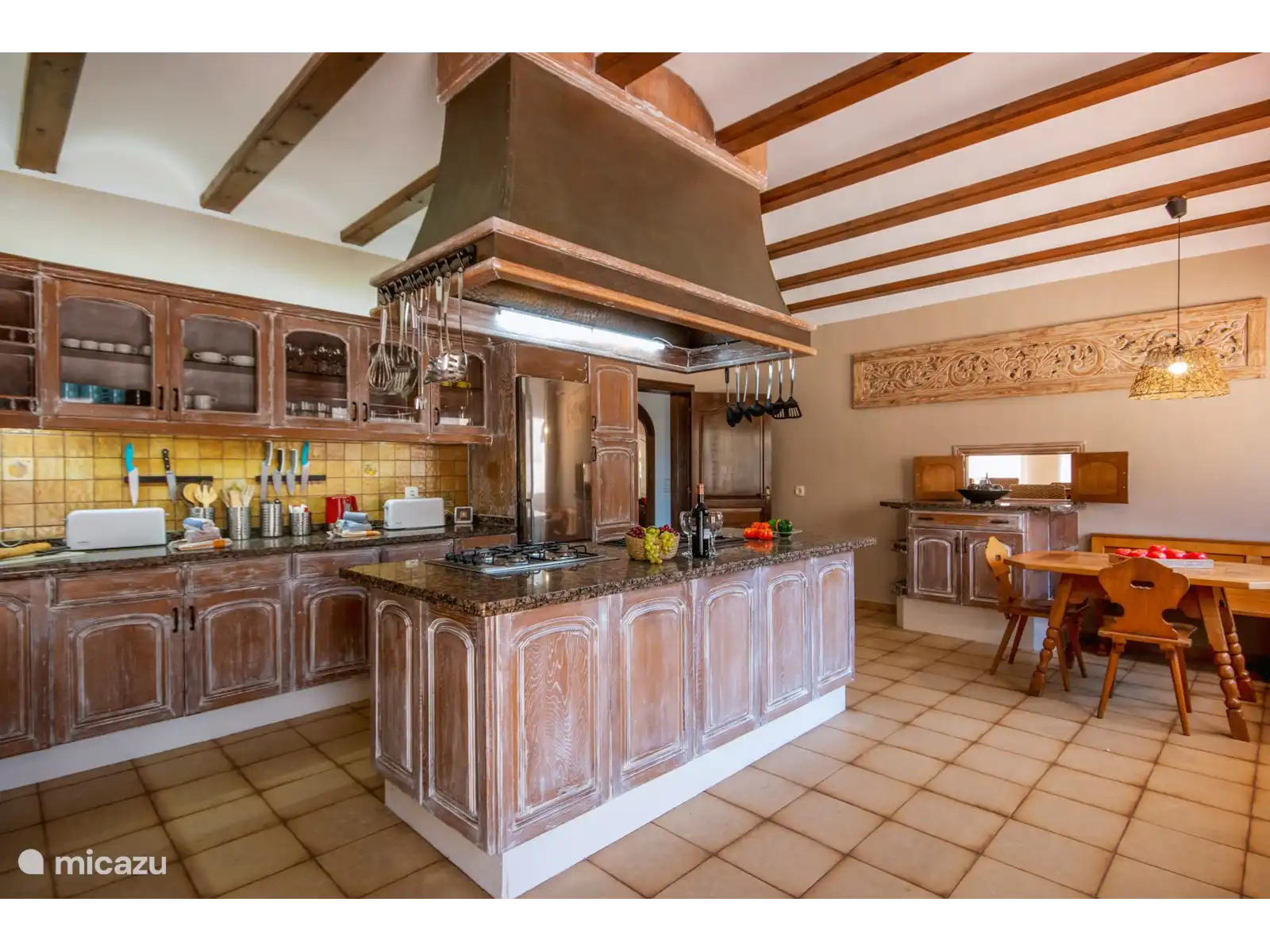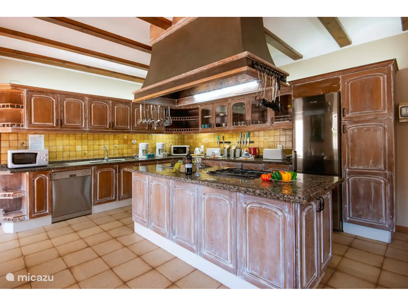 - Keuken met gasfornuis, elektrische oven, magnetron, vaatwasser, koelkast, vriezer, koffiezetapparaat, waterkoker, blender, broodrooster en citruspers