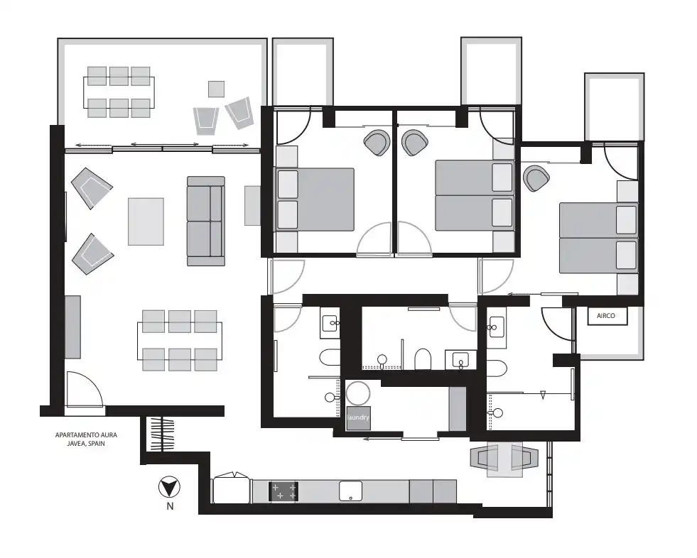 Het recentelijk compleet gerenoveerde appartement Aura is een bijzonder ruim appartement van 160 m2. De lichte, gezellige woonkamer grenst direct aan het overdekte terras op het zuiden. Er zijn 3 slaapkamers met elk een eigen terrasje en een eigen badkamer (waarvan één ensuite). Daarnaast is er een hele moderne, volledig uitgeruste keuken met een ontbijthoekje en bijkeuken.