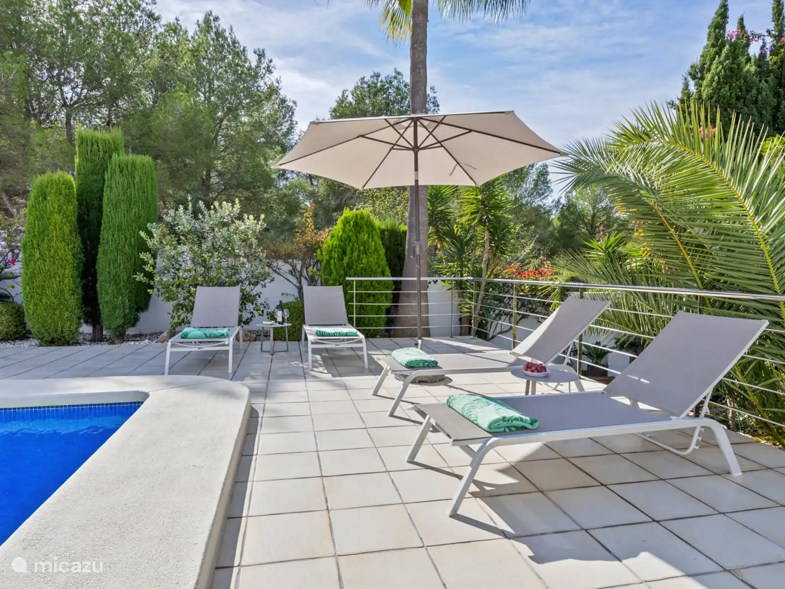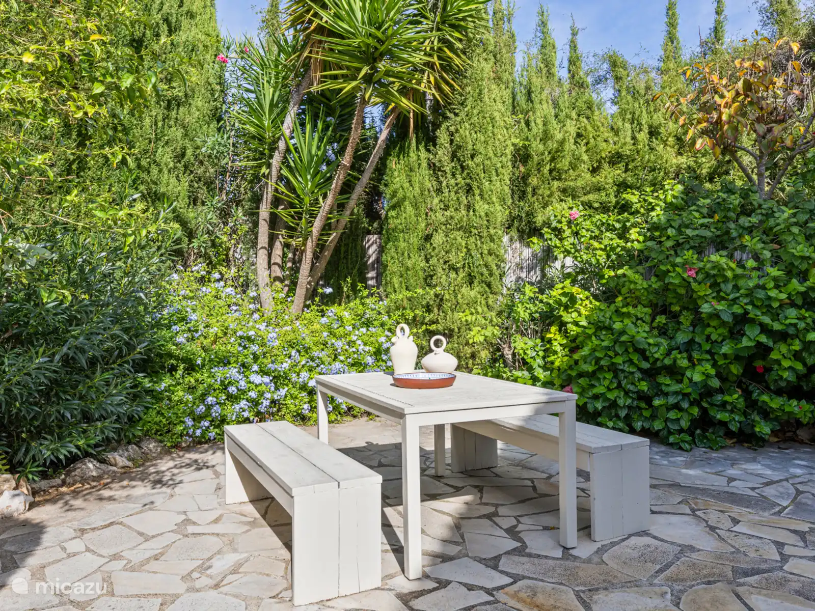 Het perceel van 1000m2 heeft een prachtige mediterrane tuin, is volledig omheind met een elektrisch bediende toegangspoort en biedt veel privacy. Het heerlijke zoutwater zwembad met jacuzzi (10 x 5 m) is omgeven door een ruim zonnig terras met ligbedden en parasols, een ruime loungehoek en een buitendouche.