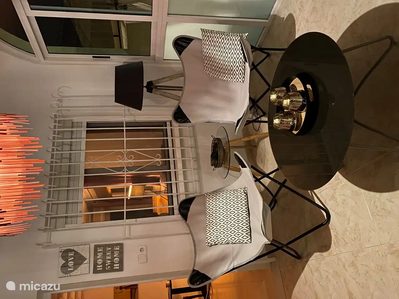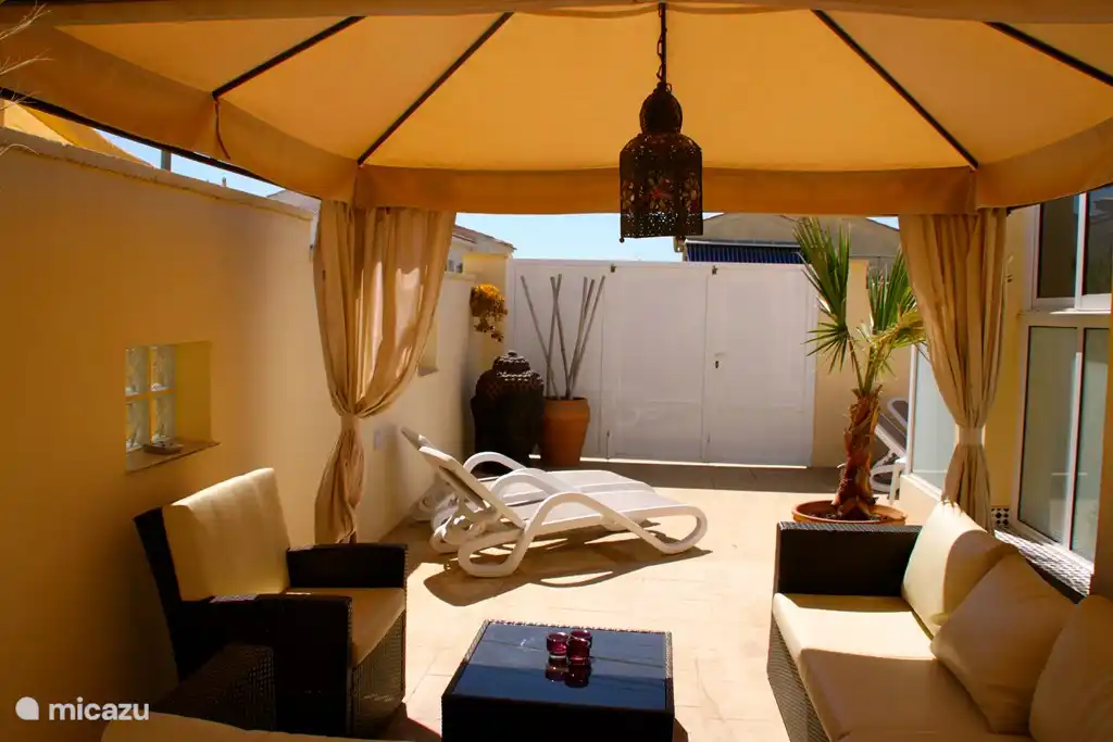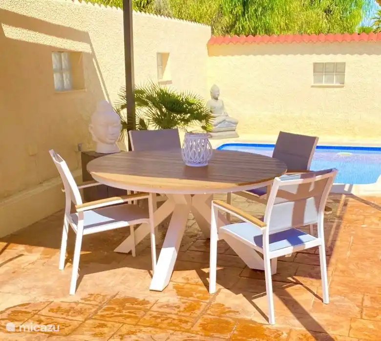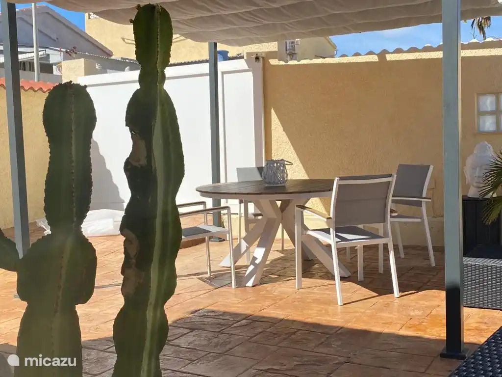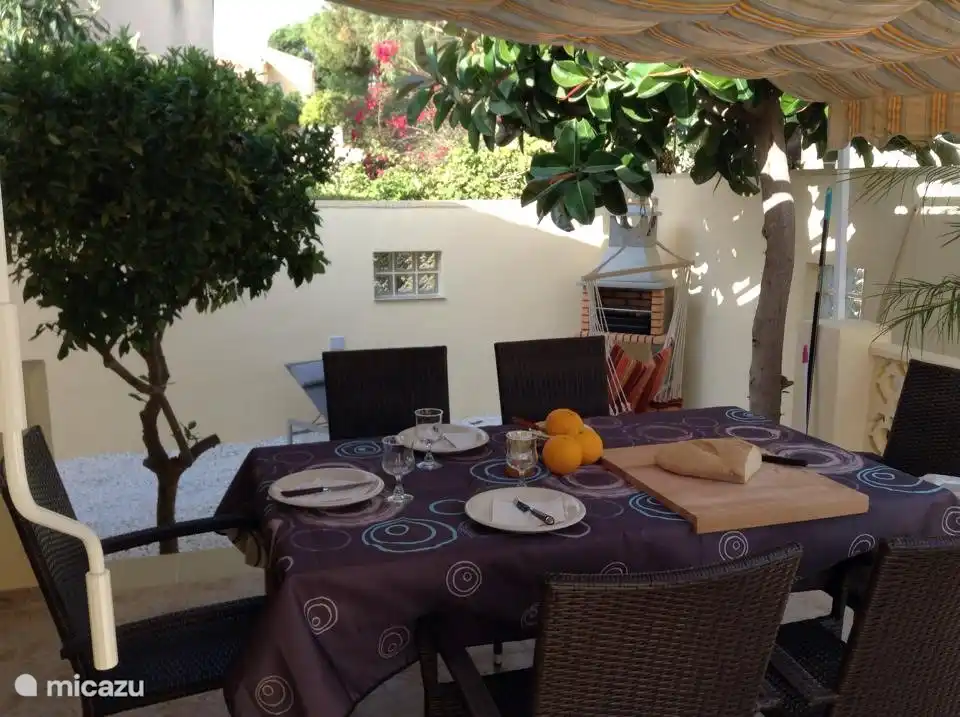 Ruim terras met grote eettafel met 6 stoelen . U kan zelf kiezen voor zon of schaduw door de zonneluifels