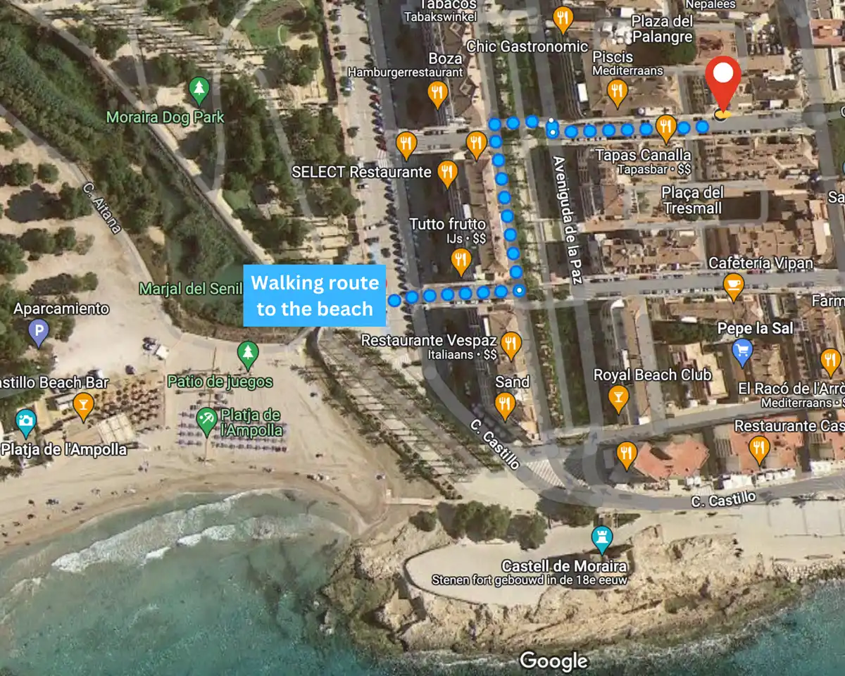 luchthaven. Luchthaven van Alicante: 91km, Luchthaven Valencia: 128km. Padelbanen op 200 meter. Leuke wandelingen vanaf het dorp zijn naar de prachtige baai van El Portet (1,5km) of, de andere kant op, via Bar la Cabana (1,5km) in de richting van La Fustera (6km) via het ecopad. Voldoende gelegenheden om tussendoor een drankje te nuttigen in een strandbar of een duik in zee te nemen.
