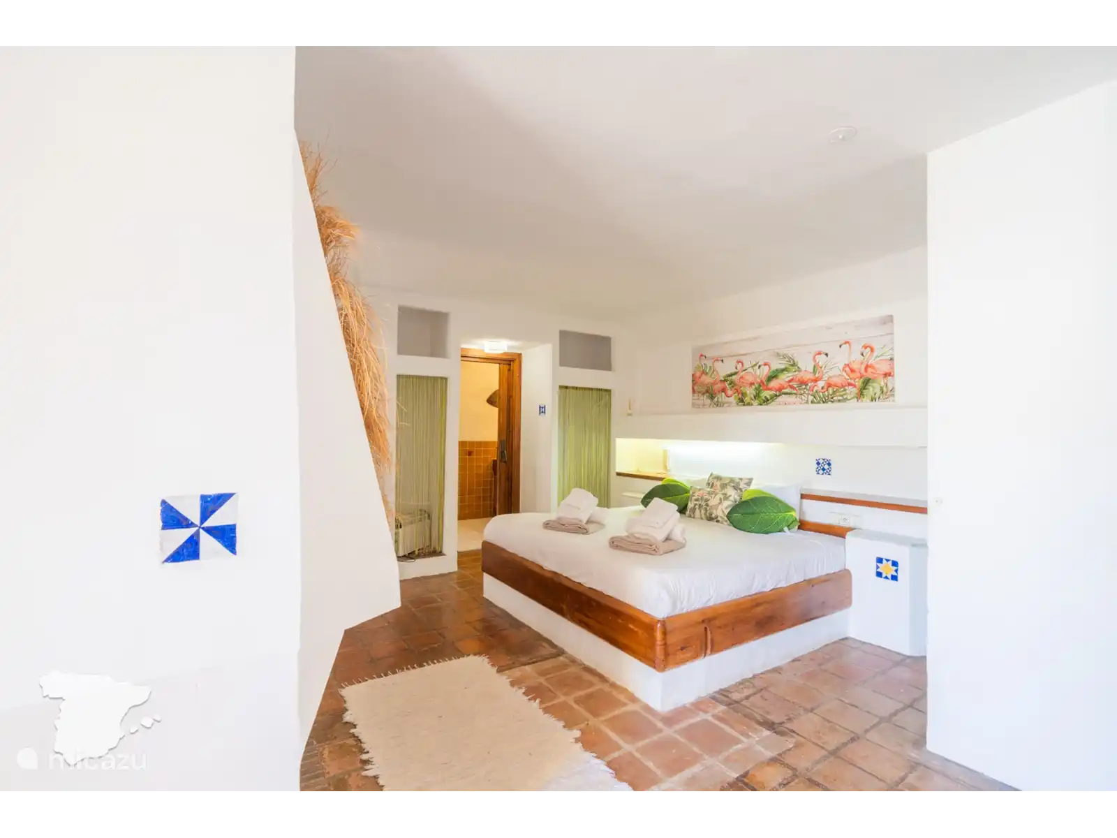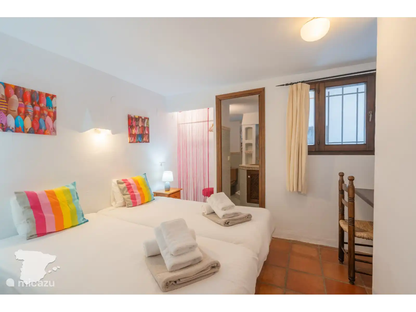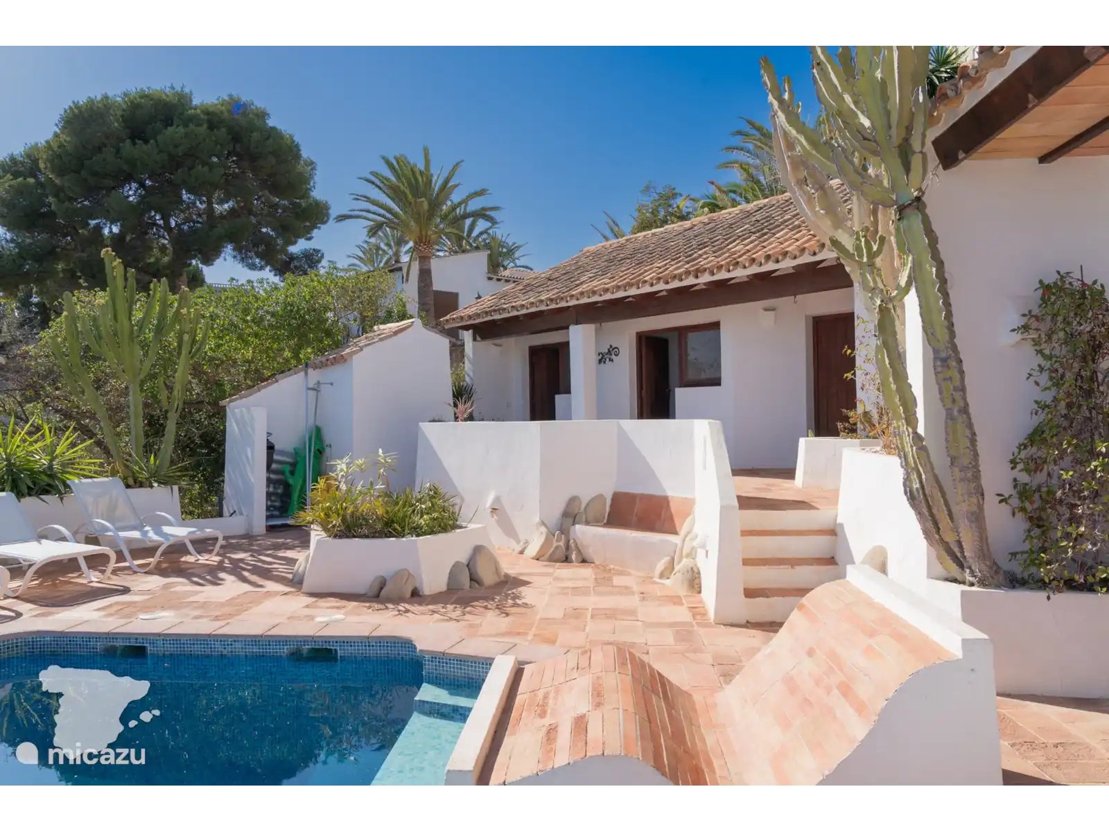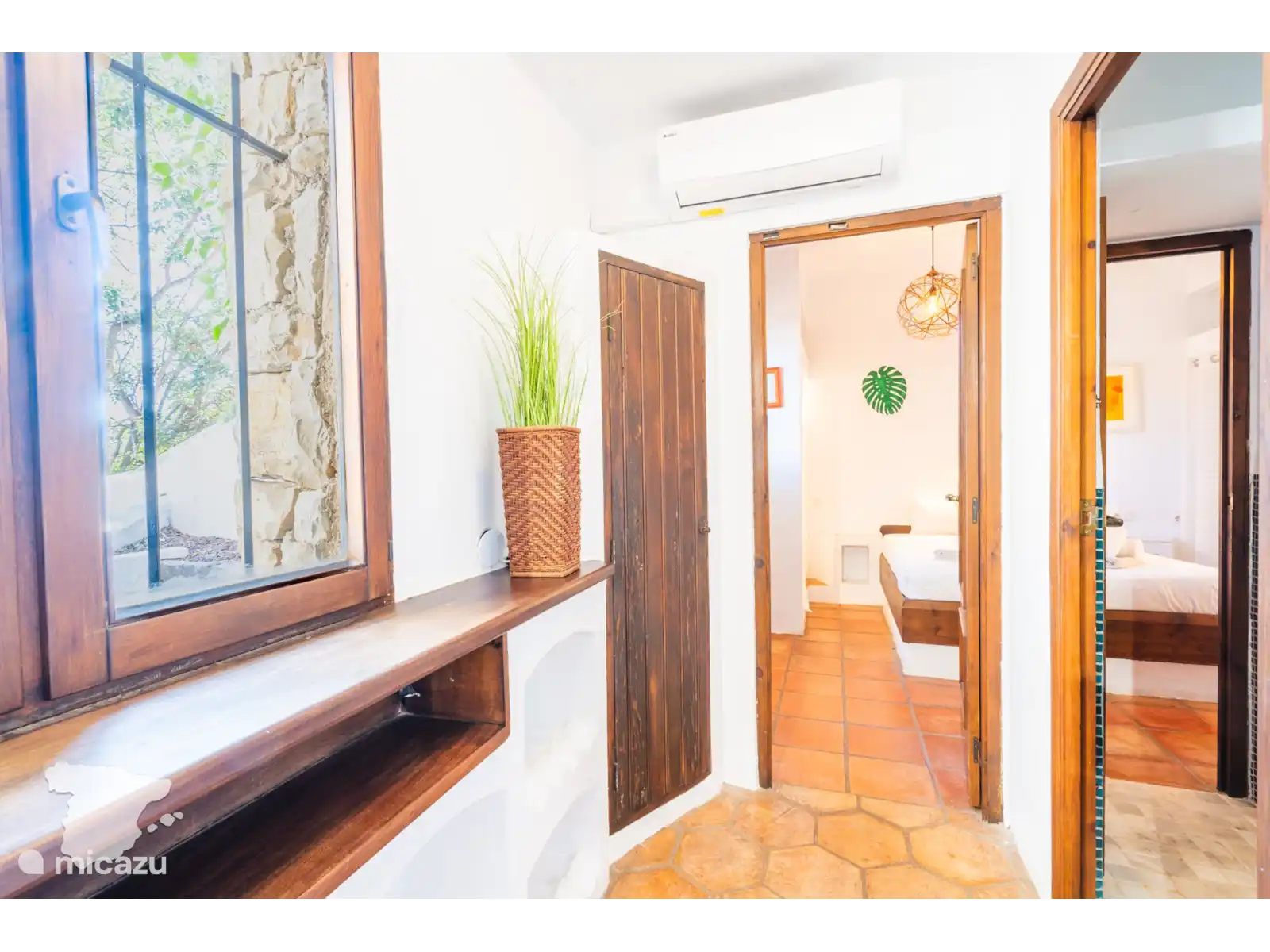De casita grenzend aan de villa heeft twee slaapkamers en een badkamer. Beide slaapkamers zijn voorzien van airconditioning en hebben toegang tot de tuin. In de ene slaapkamer vindt u een tweepersoonsbed en in de andere slaapkamer twee eenpersoonsbedden. De badkamer is voorzien van toilet, wastafel en douche.