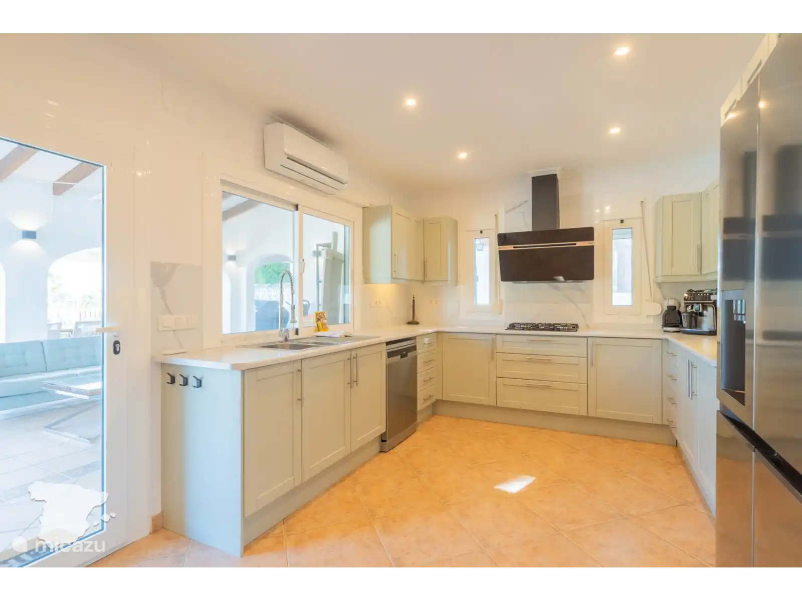 Stap de grote hal binnen die leidt naar een elegante eethoek en een aangrenzende woonkamer met twee comfortabele banken en een 75-inch smart-tv. De volledig uitgeruste keuken bevindt zich naast de eetkamer en is perfect voor het bereiden van heerlijke maaltijden. Op de begane grond vindt u tevens één slaapkamer met een tweepersoonsbed (160x210), airconditioning en kledingkast. Een aparte badkamer met douche, wastafel en toilet completeert dit niveau.