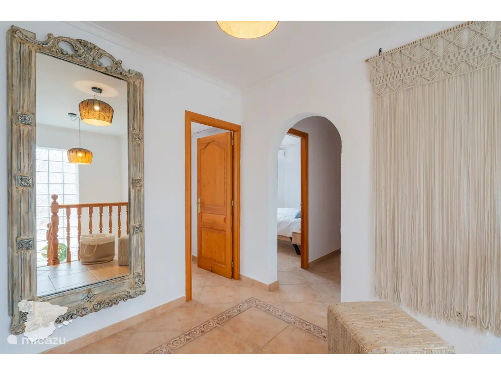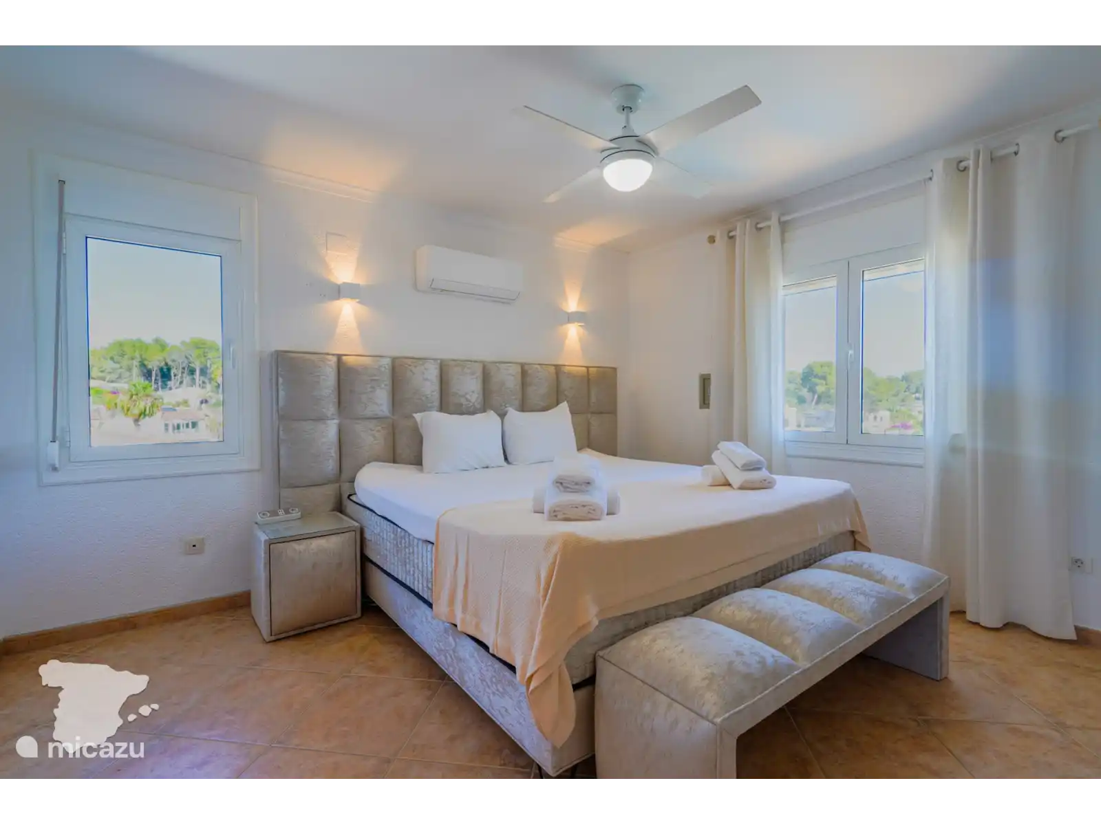 Terug naar binnen: de interne trap in de villa gaat naar de bovenste verdieping, waar zich 3 slaapkamers bevinden. Een ruime masterbedroom met een groot tweepersoonsbed (200x210), Smart TV, airconditioning, inloopkast en een ensuite badkamer voorzien van douche, wastafel en toilet. Een tweede slaapkamer met een tweepersoonsbed (180x220), airconditioning en een ensuite badkamer met douche, wastafel en toilet. Deze kamer heeft ook twee eigen balkons met een prachtig uitzicht. Een derde slaapkamer beschikt over een tweepersoonsbed (160x210), airconditioning en een inbouwkast. Tenslotte bevindt zich in de hal een aparte badkamer met douche, ligbad, wastafel en toilet.