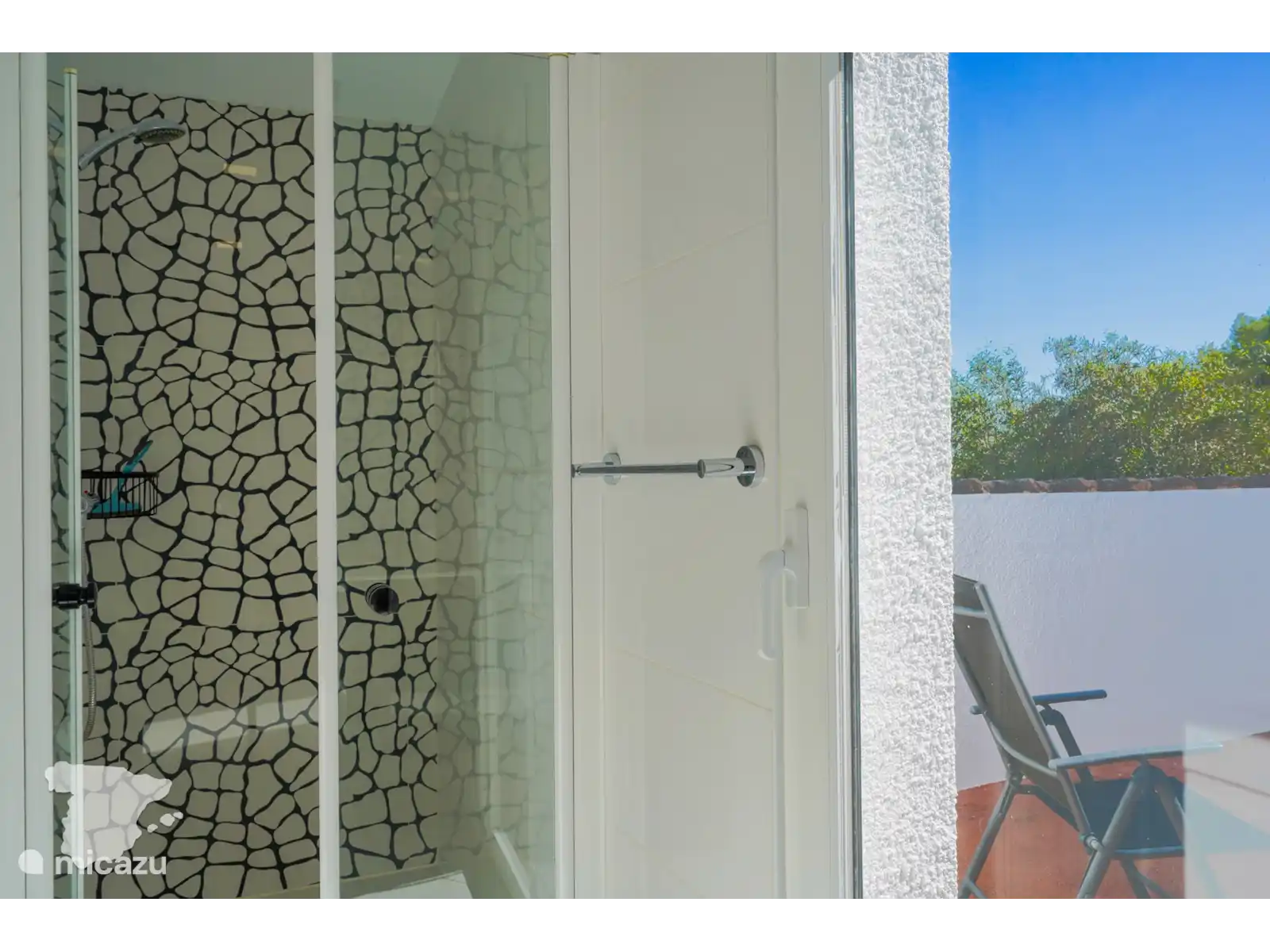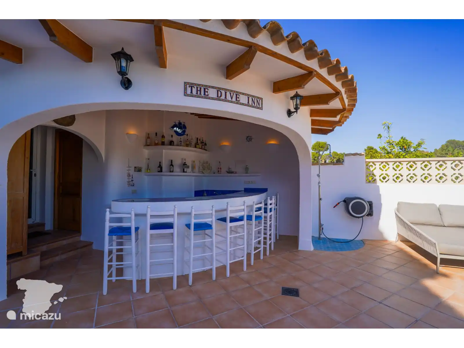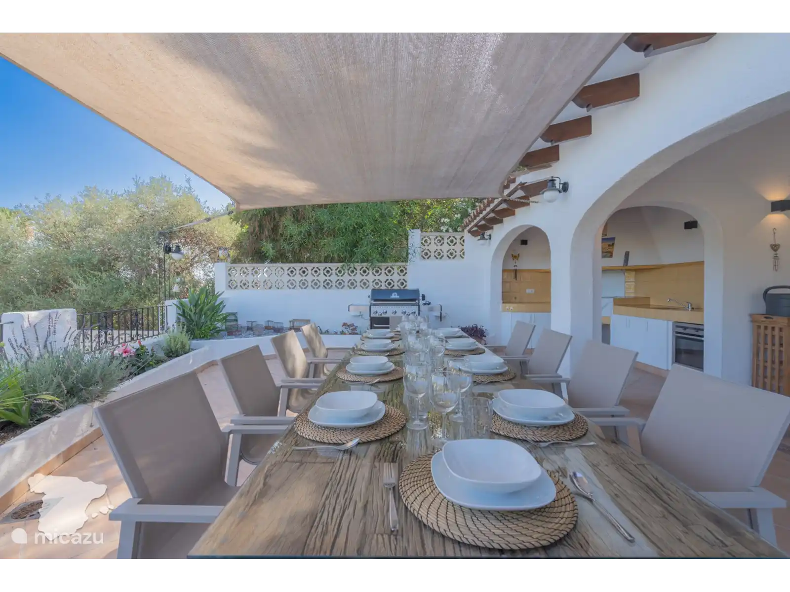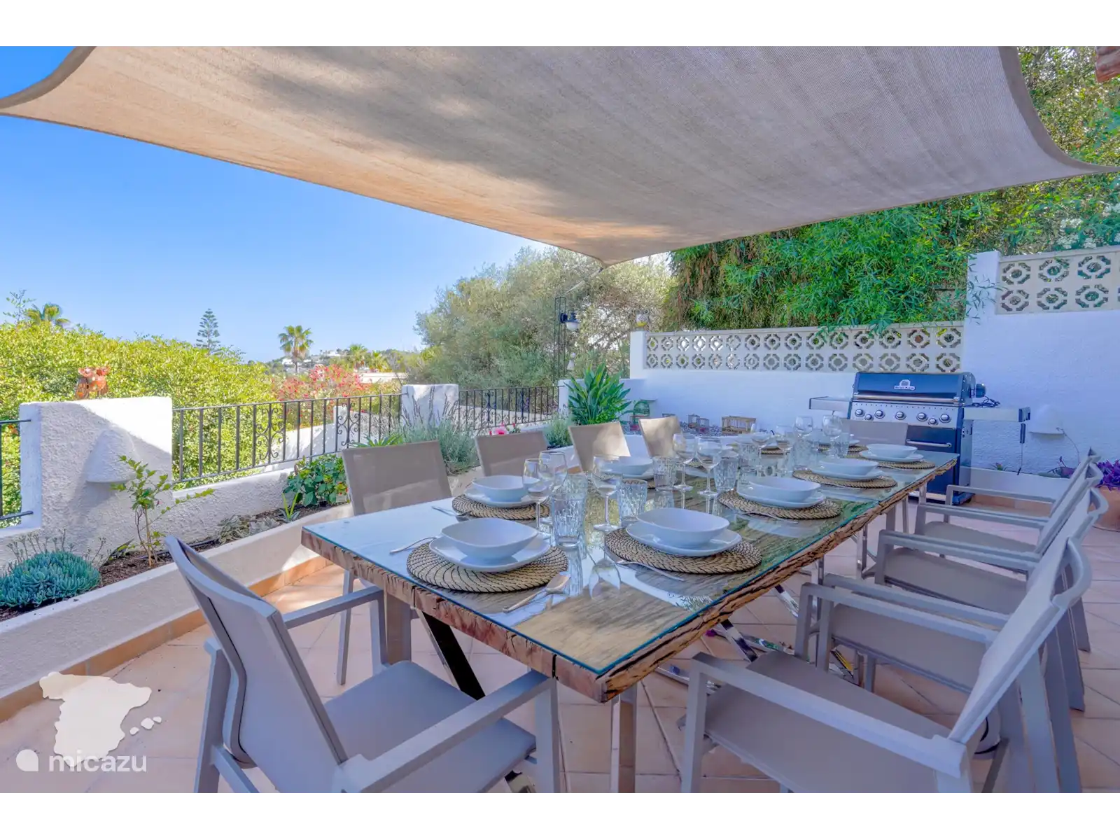 Het ruime buitenterras biedt een prachtig uitzicht op zee en beschikt over een buitenkeuken en een eettafel voor 12 personen. Het privézwembad, dat op verzoek kan worden verwarmd (zie onderstaande voorwaarden), is omgeven door ligbedden en beschikt over een bar bij het zwembad met een koelkast en een Broil King-BBQ. Daarnaast is er achter de bar een badkamer met douche, wastafel en toilet. In de tuin en rondom het zwembad heeft u veel privacy. U kunt genieten van een spelletje jeu de boules in de daarvoor bestemde ruimte naast het zwembad. Daarnaast is er voor het huis nog een gasbarbecue, loungeset en tafeltennistafel voor extra vermaak.