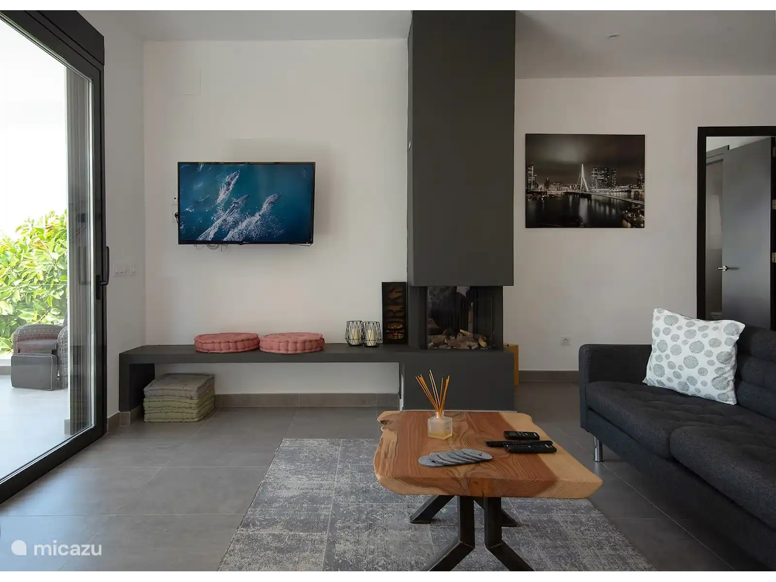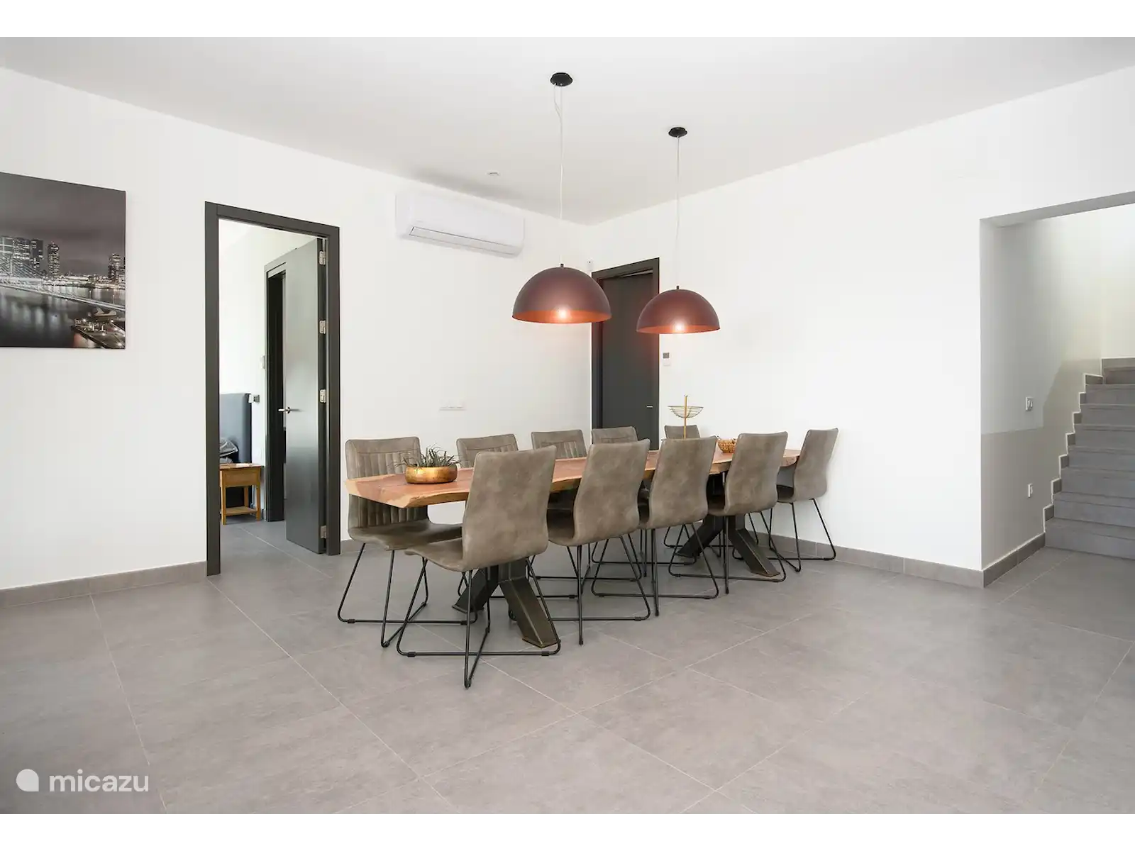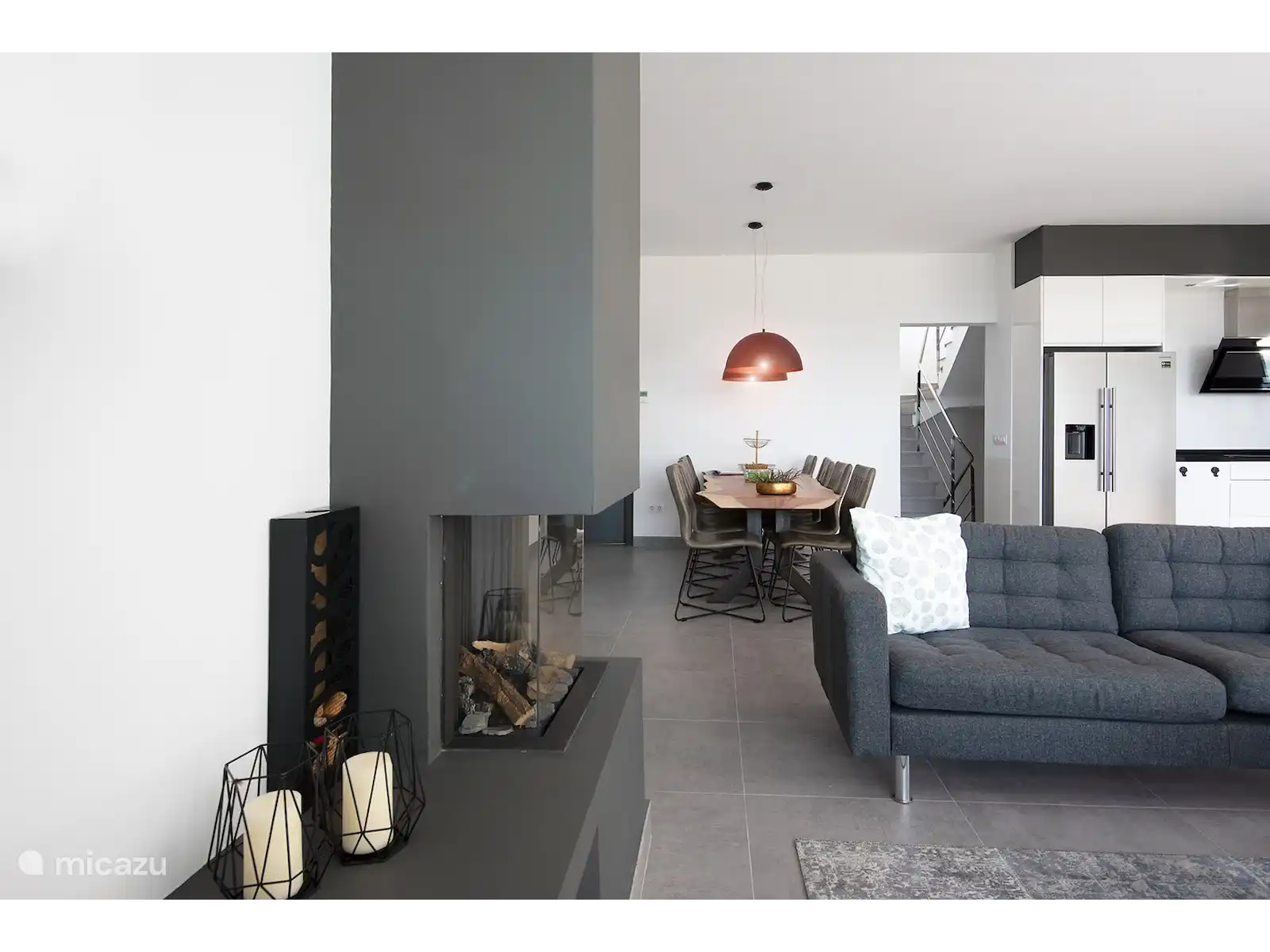 Meerdere zithoeken met grote eigen raampartijen en dus een fantastisch uitzicht. De twee 3 persoonsbanken, fauteuils en haardbank bij de moderne gashaard geven meer dan voldoende zitruimte. Een 4 meter brede schuifpui geeft toegang tot de overdekte Naya direct aan de zitkamer. Hier is een grote tafel (3,30 meter) met stoelen geplaatst. Via de Naya kunt u langs het huis en een buitentrap naar het zwembad op de begane grond.