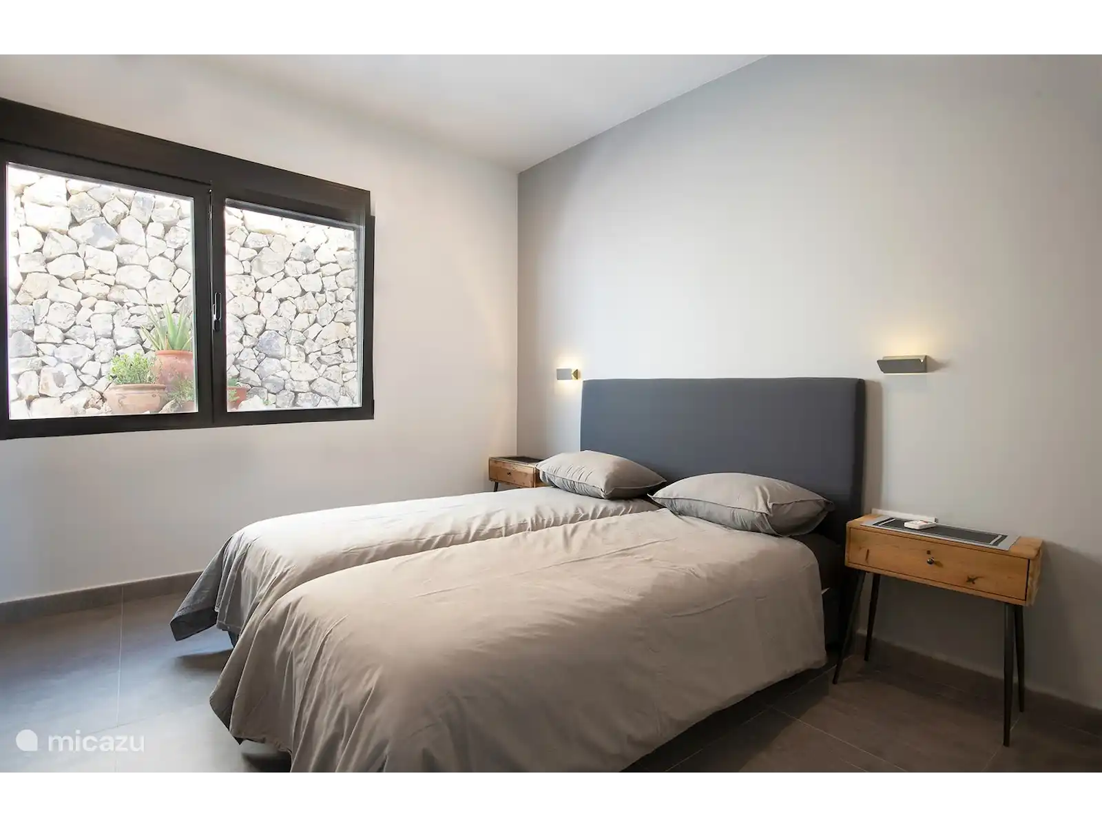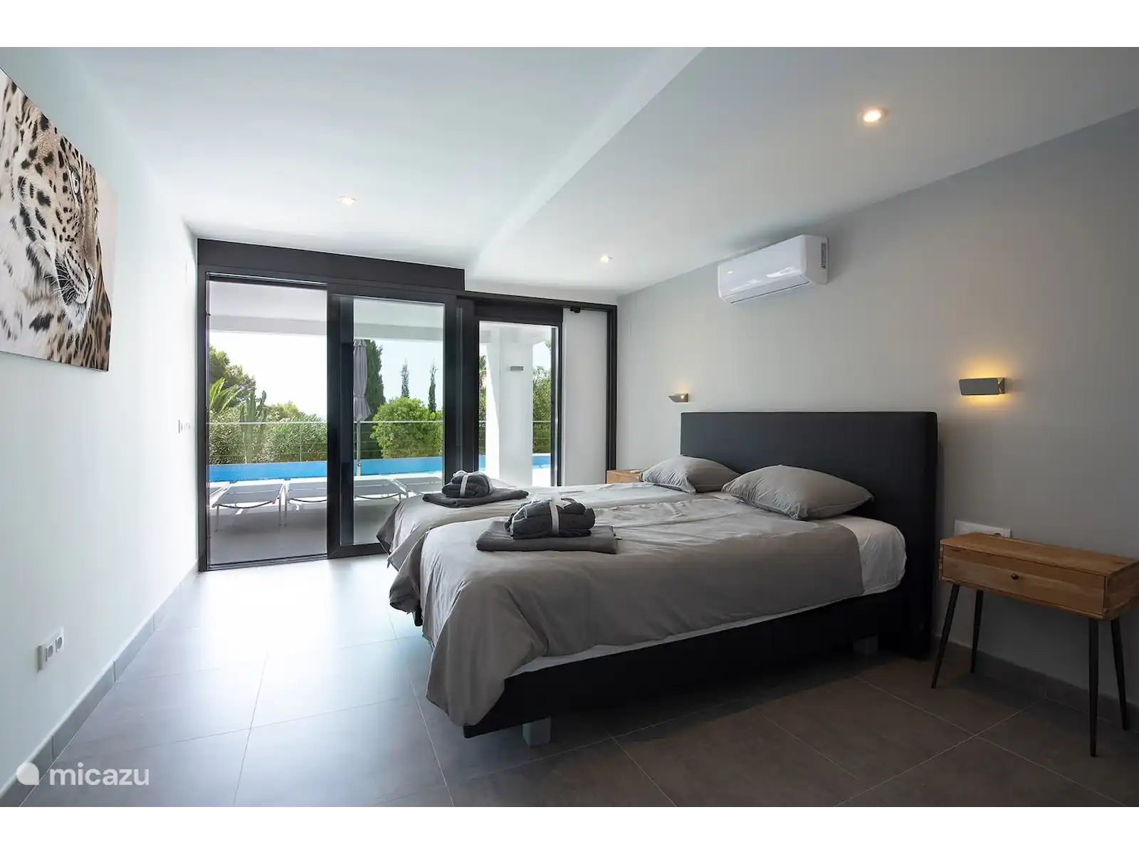 U kunt via het inpandige trappenhuis naar de begane grond waar u direct beneden aan de trap de toegang aantreft tot de wasruimte met een wasmachine en wasdroger. U treft daar ook de 2 ruime slaapkamers op deze verdieping aan met beiden zeezicht en een en-suite badkamer en een eigen inloopkast. Beide kamers hebben een extra breed en lang bed (1,80 X 2,10 meter). Een enorme schuifpui met veel zicht in beide slaapkamers geeft toegang tot een overdekte veranda en het zwembadterras. Zo vanuit je slaapkamer het zwembad in.