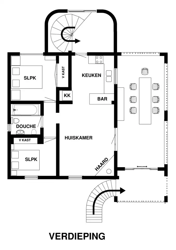 De beneden verdieping bestaat uit een woonkamer met TV (met chromecast), 2 slaapkamers met 2 eenpersoonsbedden, eetkeuken met koffie-en-theefaciliteiten en een badkamer met douche, toilet en wastafel.
