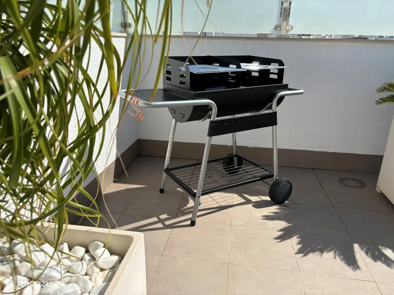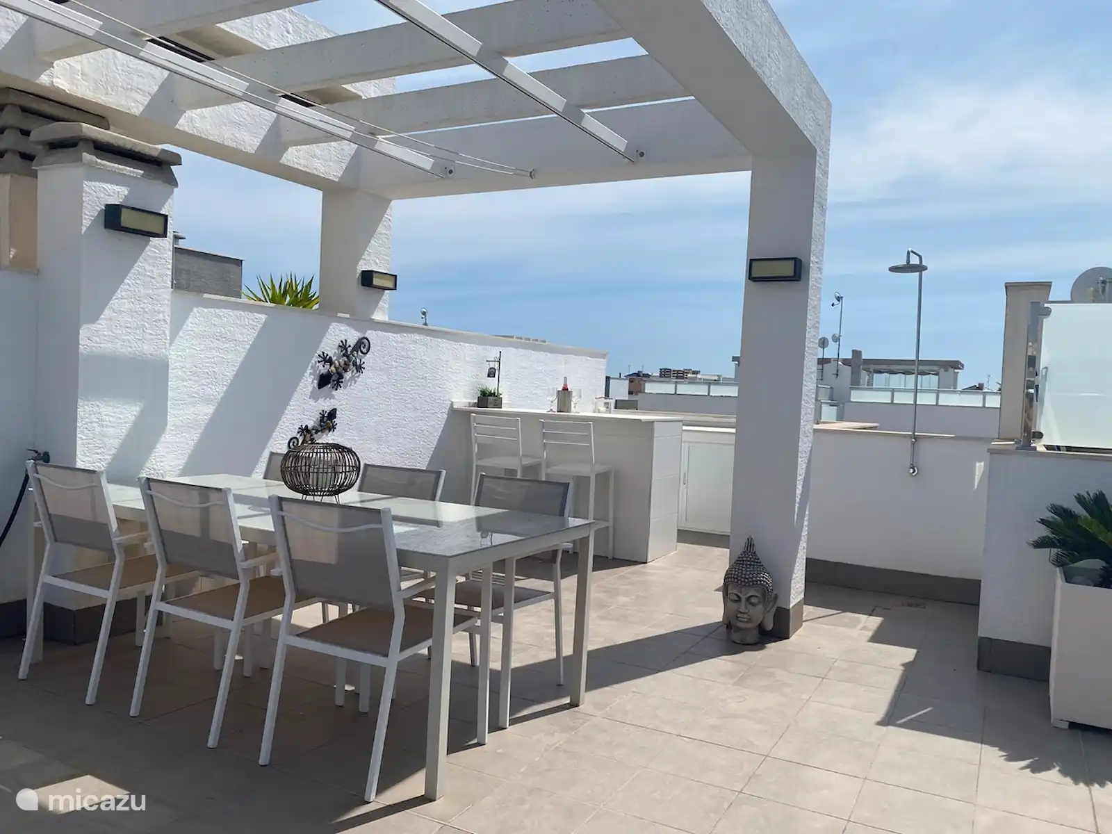 Het appartement beschikt over een balkon met zonnescherm en een ruim dakterras van 60 m2 van waaruit u een mooi uitzicht heeft op het zwembad, de gezamenlijke tuin en zee. Het dakterras is ingericht met fraaie 6 persoons eethoek met zonnedoek, lounge-set, 2 zonnebedden, buitenkeuken met BBQ, bar, wasmachine en buitendouche.