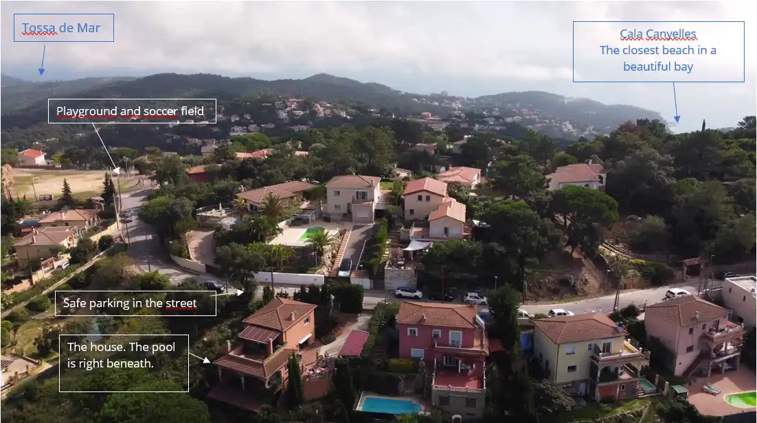 De prachtige baai Cala Canyelles ligt direct aan de voet van de berg op 7 minuten rijden. Maar verken vooral ook de andere mooie stranden in de buurt.Lloret de mar en Tossa de mar liggen op ca. 15 min rijden. Girona airport op 45 min. Barcelona op 1u15 min. (Barcelona is goed bereikbaar per trein. Gratis parkeren bij het treinstation in Blanes). Je kunt vanaf de villa prachtige wandelingen maken in de bossen. Er is voldoende parkeerruimte voor meerdere auto’s. Dichtbij een speeltuin en speelveld. Alles voor een heerlijke familievakantie.