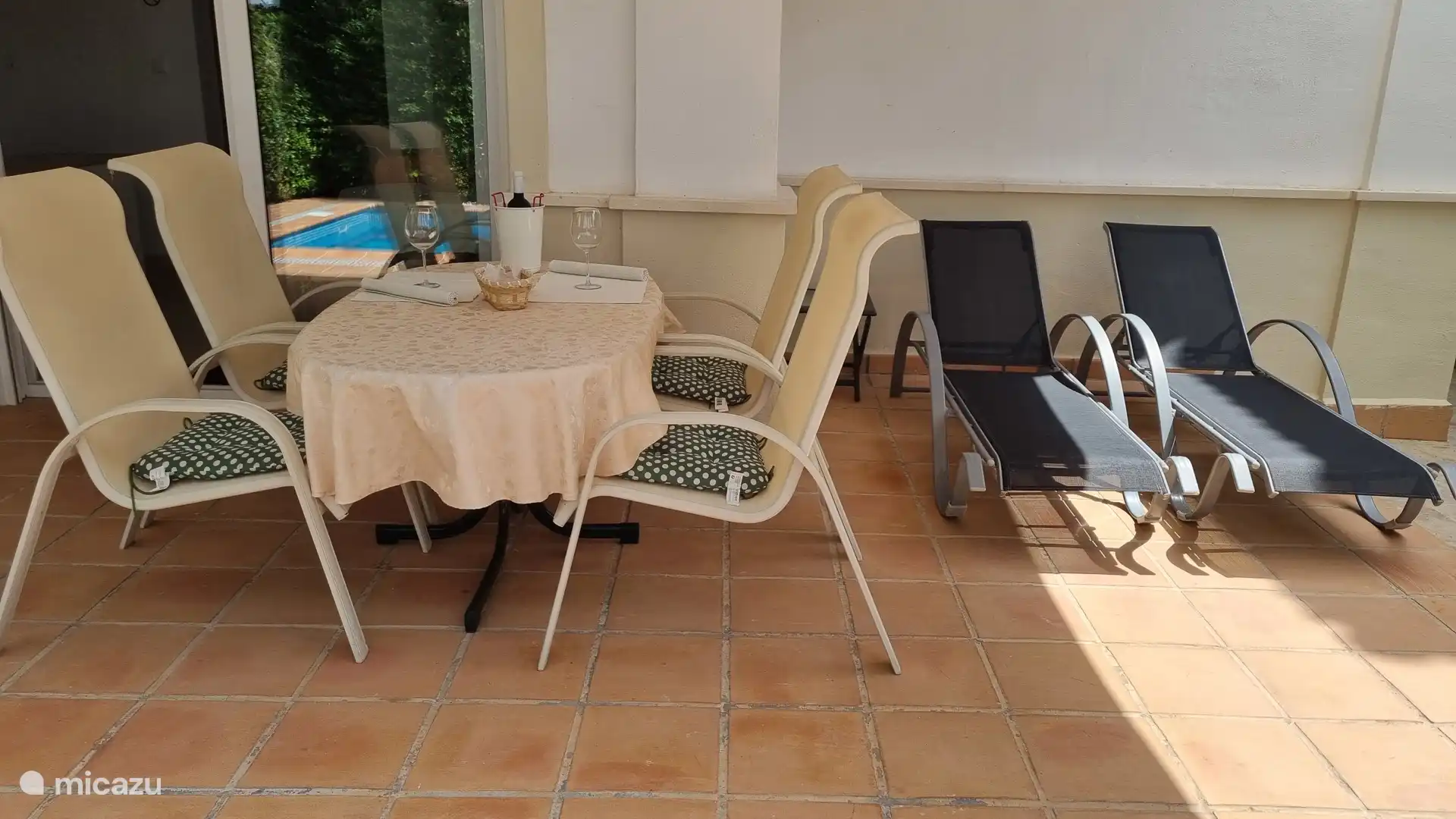 Vanuit de woonkamer heeft u toegang tot het overdekte terras met barbecue, eethoek en ligstoelen.