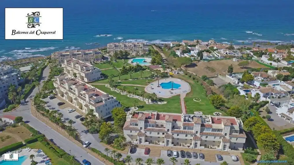 De residentie Balcones del Chaparral  bevindt zich op een 300 tal meter van de Middellandse Zee. Het gezellige zandstrand , Playa Del Charcon ( op 600 meter) kan je bereiken via wandelpad. In de onmiddellijke omgeving ( op 300 meter ) vind je verschillende horeca zaken : Apotheek , superette, restaurants : Italiaan, Spaans, Indisch, en typische Spaans ( Britse) bars aan democratische prijzen. Er is dichtbij een bushalte die je vlot naar Malaga, Marbella of Fuengirola brengt.Grote zandstranden in Fuengirola en La Cala de Mijas liggen op een 3-tal km.