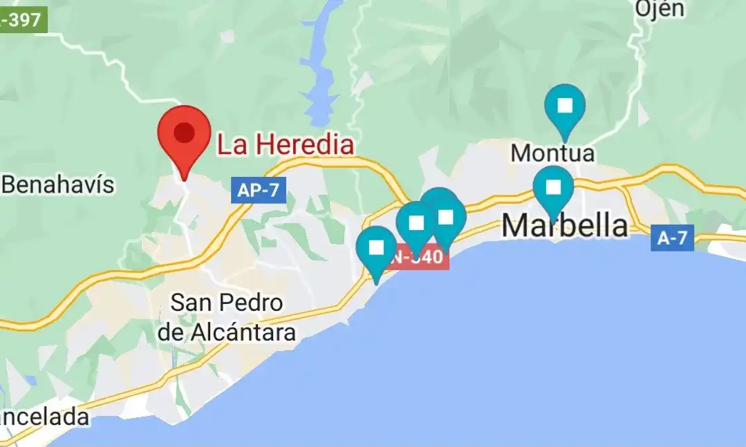 De prachtige Pueblo van La Heredia ligt op slechts een paar minuten rijden van San Pedro en Benahavís. Puerto Banus en Marbella liggen op 15 minuten rijden en de luchthaven van Malaga op 40 minuten.