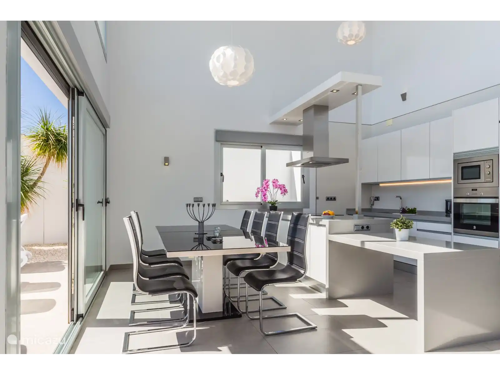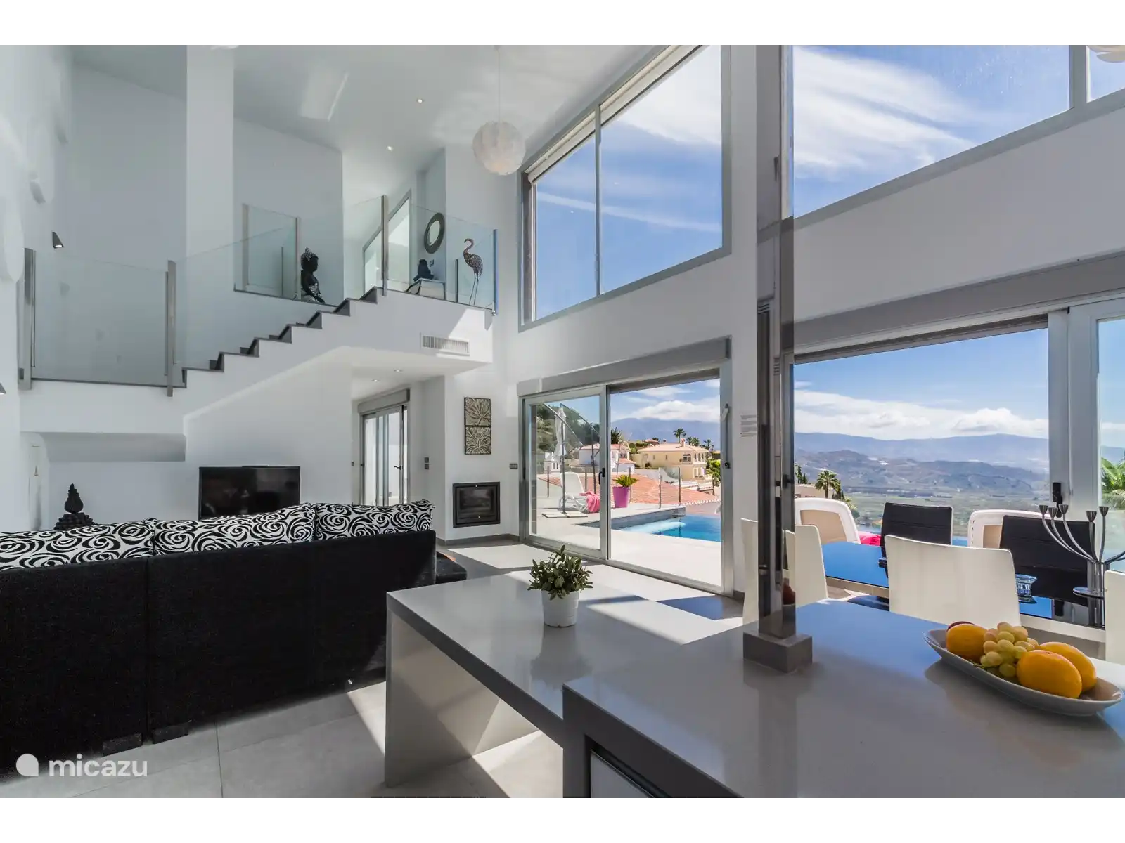 Met een trap naar beneden komt u op het hoofdniveau van de villa, waar u de open woonkamer vindt. Deze open woonkamer heeft hoge plafonds met hoge ramen, zodat u kunt genieten van het uitzicht op het zwembad, de zee en de bergen. De woonkamer heeft een houtkachel om u warm te houden tijdens koele winteravonden. De keuken is modern, beschikt over een kookeiland en is van alle gemakken voorzien. Omdat de indeling open is, kunt u tijdens het koken contact houden met de mensen in de woonkamer. De woonkamer komt uit op het terras bij het zwembad, zodat u gemakkelijk van binnen naar buiten kunt lopen.