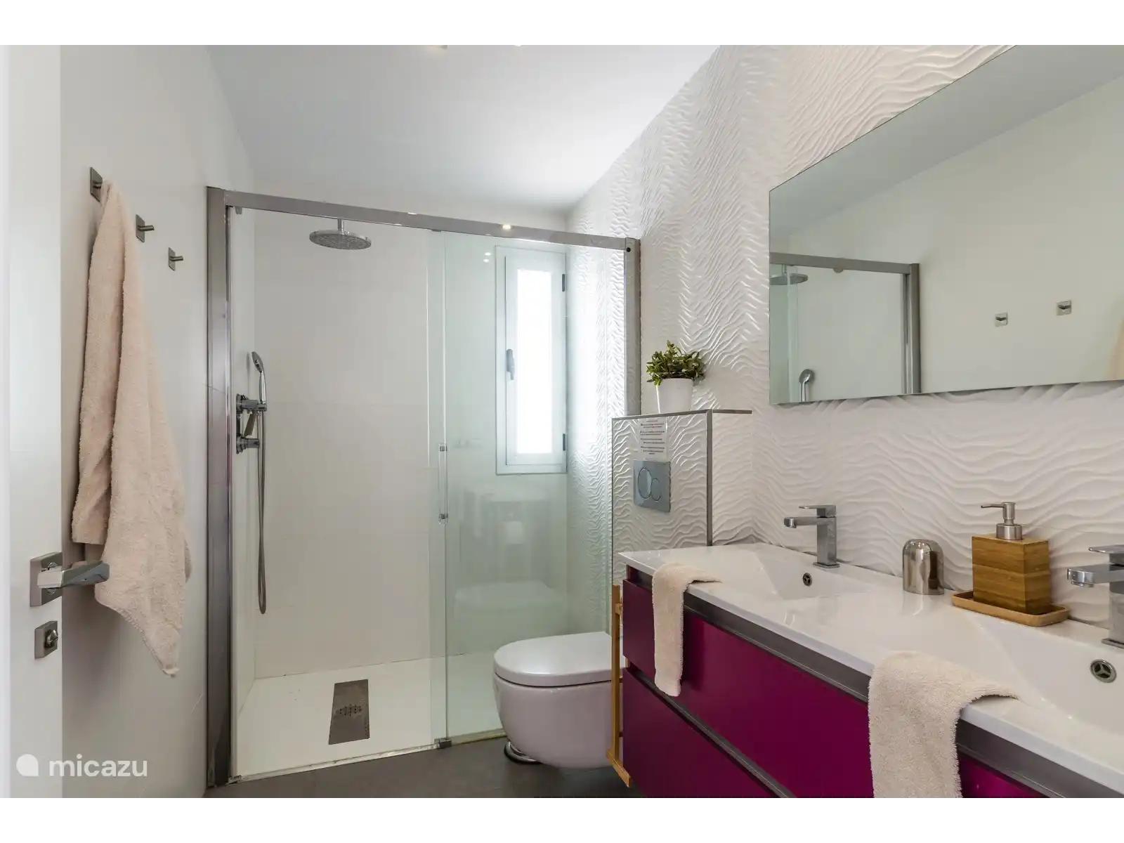 Er zijn 2 slaapkamers op dit hoofdniveau van de villa. De ene heeft een tweepersoonsbed (160 centimeter) en de andere heeft 2 eenpersoonsbedden. Beide slaapkamers hebben directe toegang tot het zwembadterras en een fantastisch uitzicht. De slaapkamers hebben elektrische rolluiken. Er is een familiebadkamer voor het gebruik van beide slaapkamers met een grote inloopdouche en dubbele wastafels. Er is ook een gastentoilet.