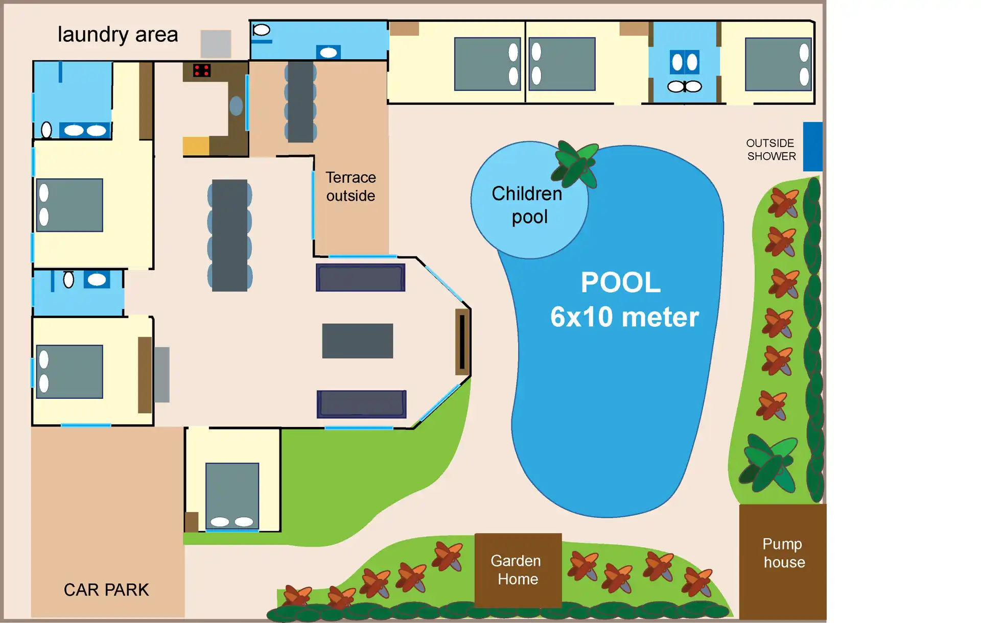 There are 6 bedrooms and 5 bathrooms. The master bedroom features a walk-in closet and a large en-suite bathroom with a shower and toilet. The other bedrooms each have a double bed and an en-suite bathroom with a shower and toilet. (Two bedrooms share a bathroom.)